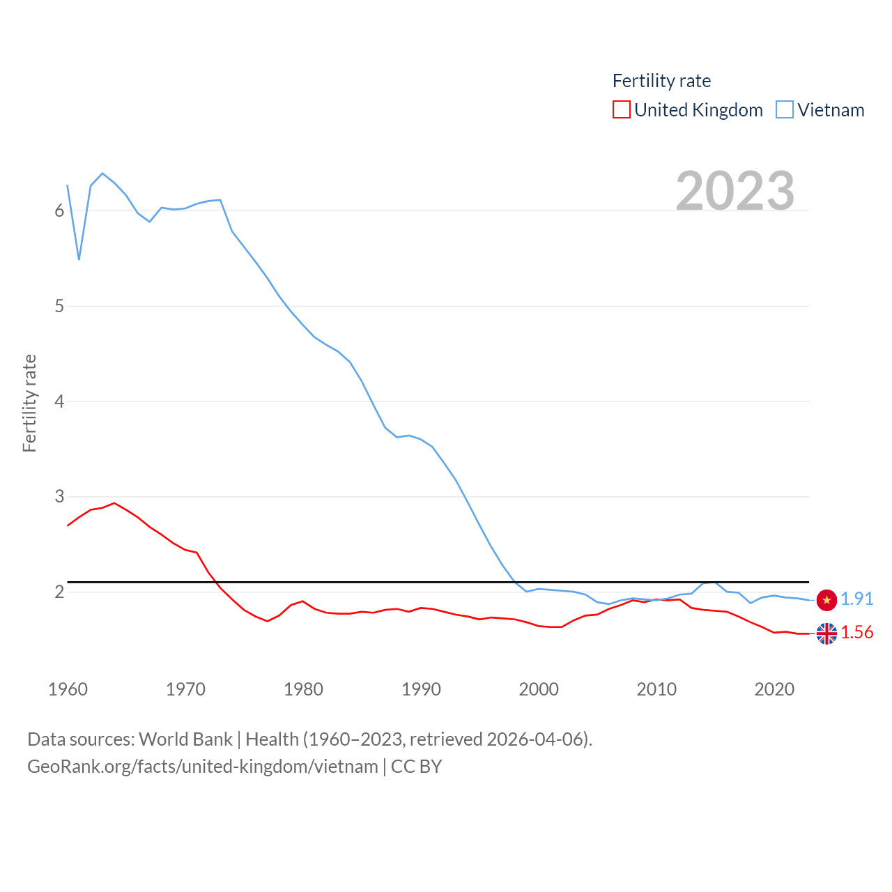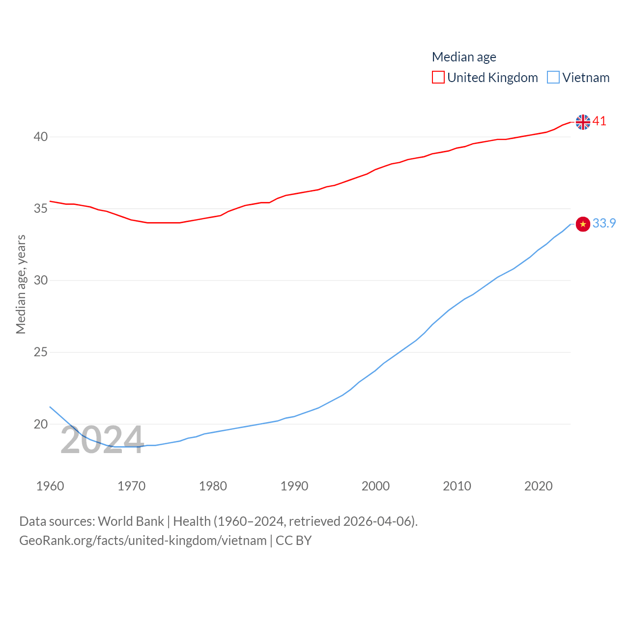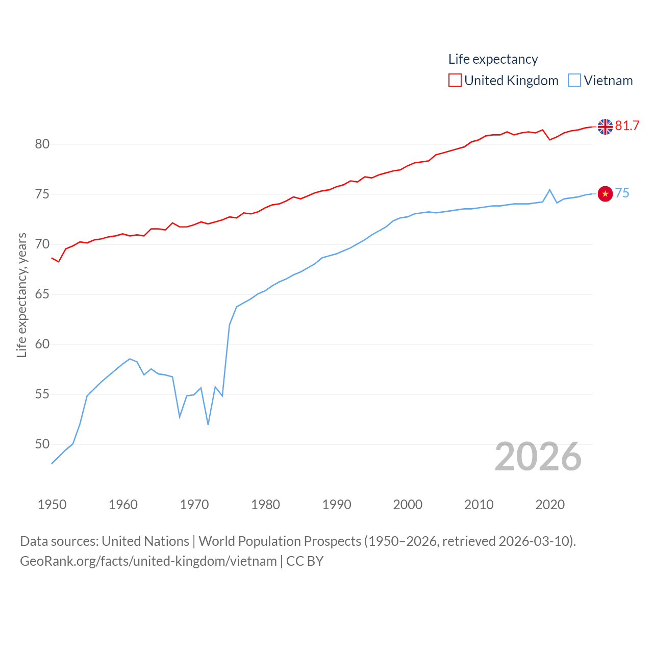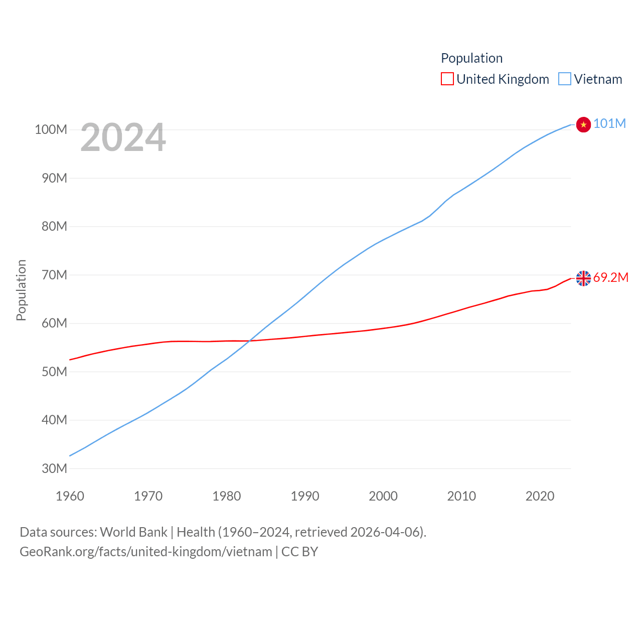 The United Kingdom has a population of 69.2M (ranked 21/197), compared with 101M in Vietnam (ranked 16/197). The United Kingdom's land area is 93,410 sq mi versus 121,016 sq mi for Vietnam (ranked 78th vs. 67th).