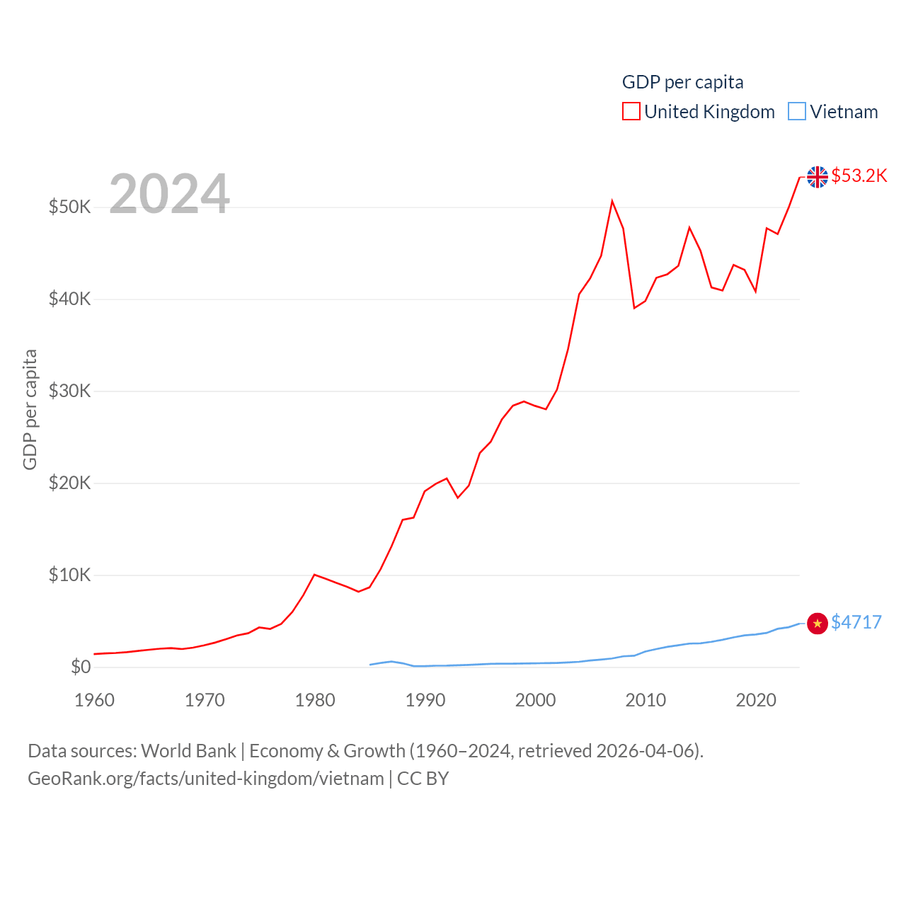 By GDP, The United Kingdom ranks 6/197 ($3.69T) and Vietnam ranks 33/197 ($476B). By GDP per capita, The United Kingdom ranks 22/197 ($53,246), while Vietnam ranks 122/197 ($4,717).