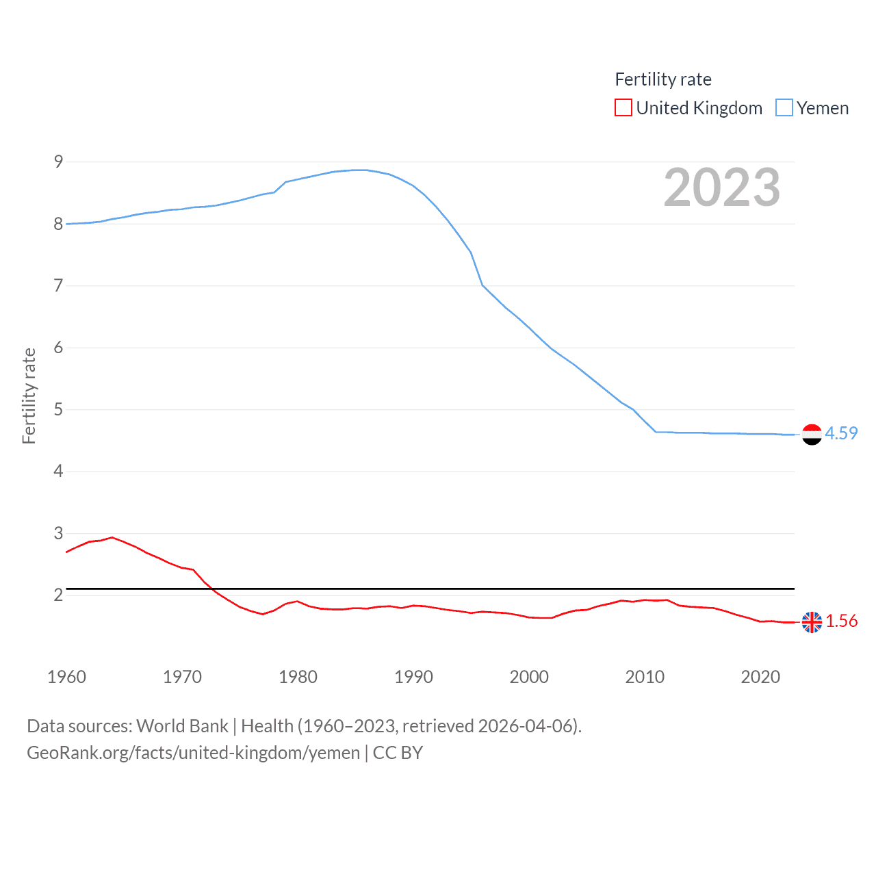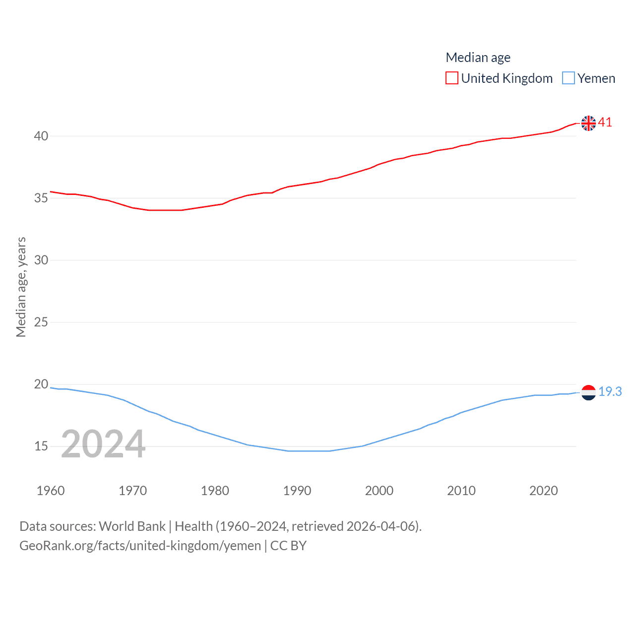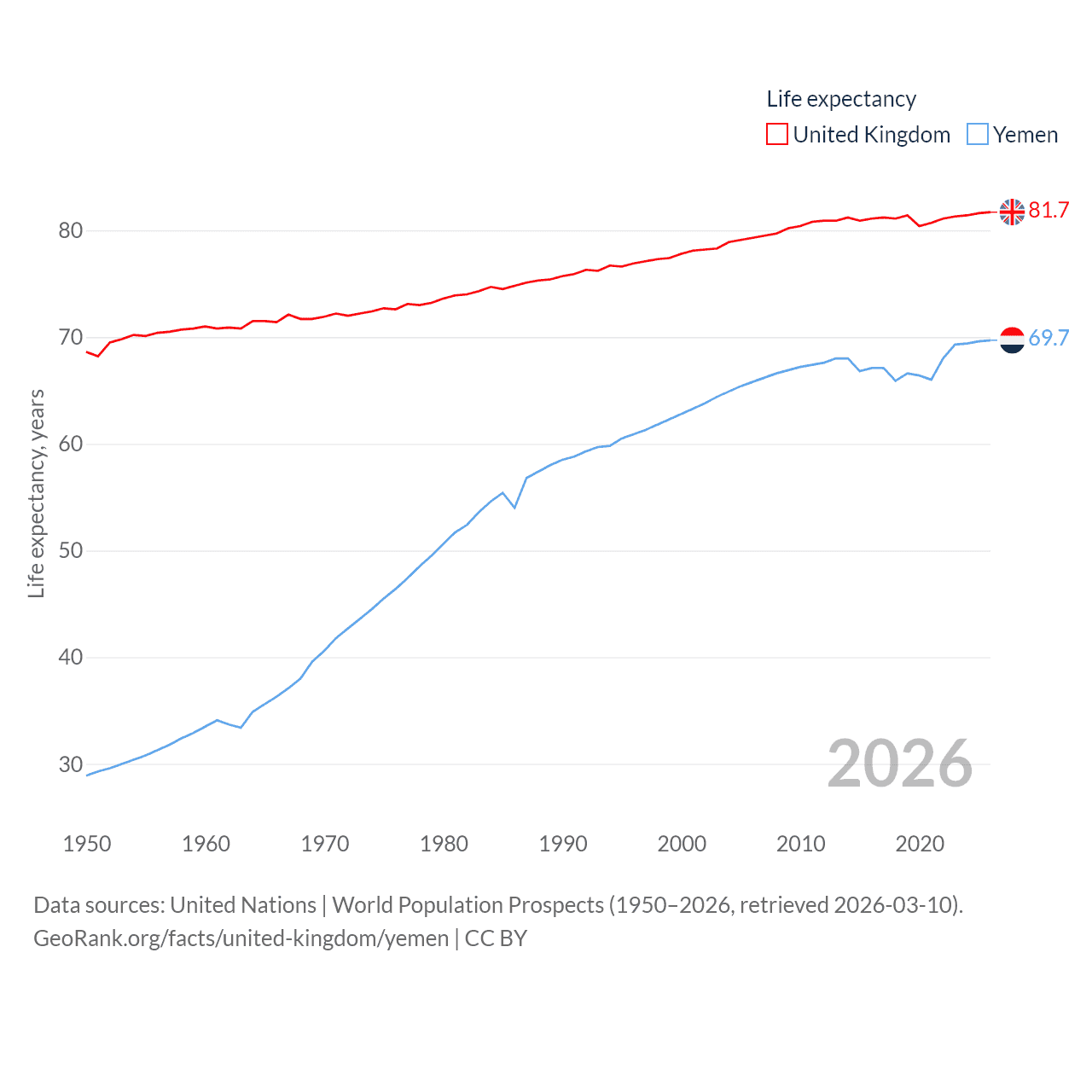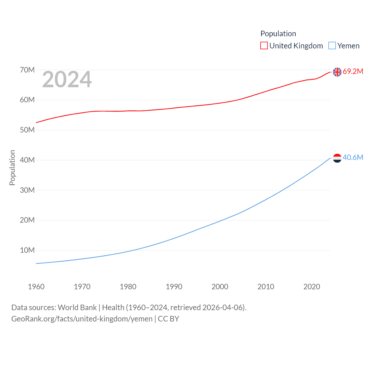 The United Kingdom has a population of 69.2M (ranked 21/197), compared with 40.6M in Yemen (ranked 38/197). The United Kingdom's land area is 93,410 sq mi versus 203,850 sq mi for Yemen (ranked 78th vs. 49th).