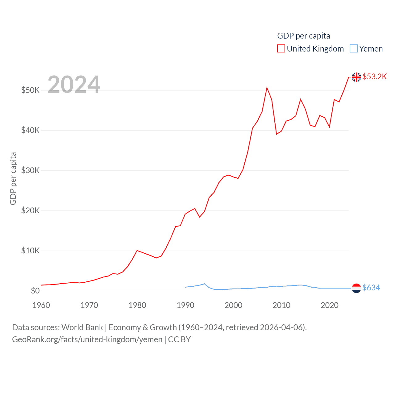 By GDP, The United Kingdom ranks 6/197 ($3.69T) and Yemen ranks 125/197 ($21.6B). By GDP per capita, The United Kingdom ranks 22/197 ($53,246), while Yemen ranks 191/197 ($634).