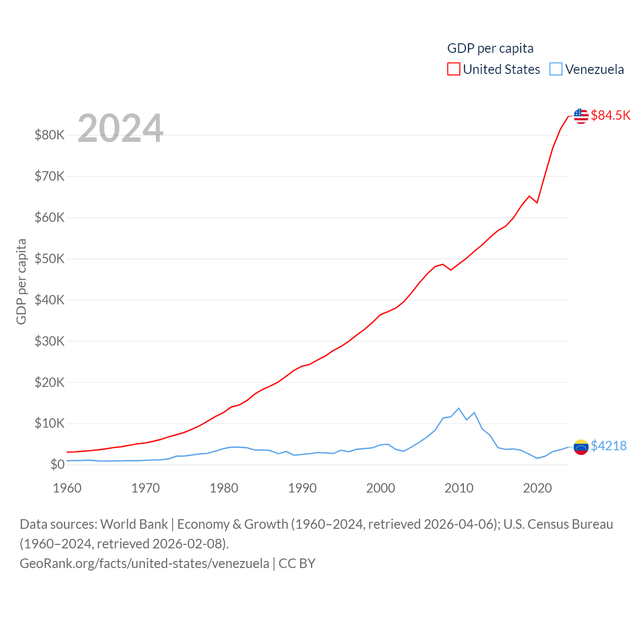 By GDP, The United States ranks 1/197 ($28.8T) and Venezuela ranks 65/197 ($120B). By GDP per capita, The United States ranks 10/197 ($84,534), while Venezuela ranks 128/197 ($4,218).