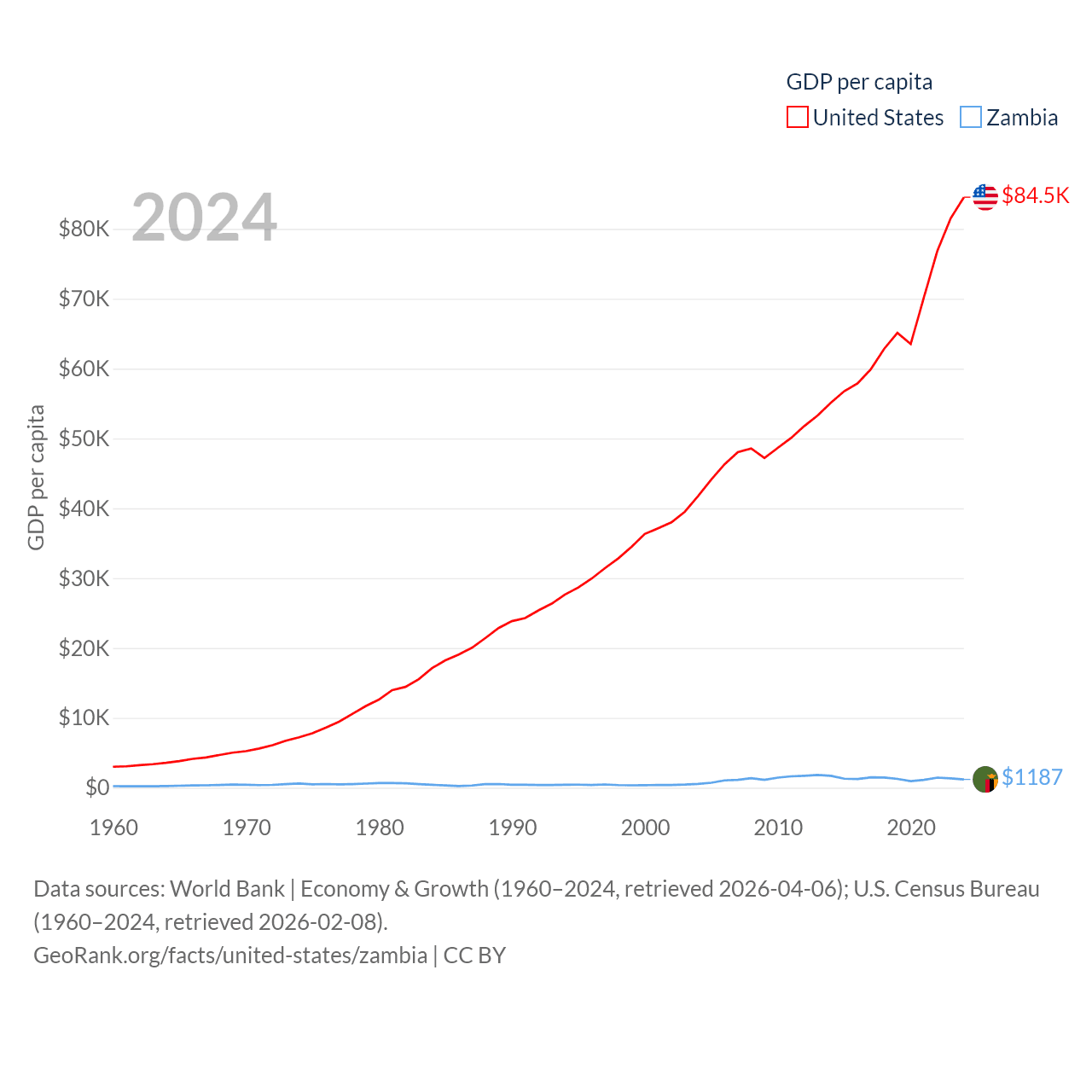 By GDP, The United States ranks 1/197 ($28.8T) and Zambia ranks 116/197 ($25.3B). By GDP per capita, The United States ranks 10/197 ($84,534), while Zambia ranks 169/197 ($1,187).