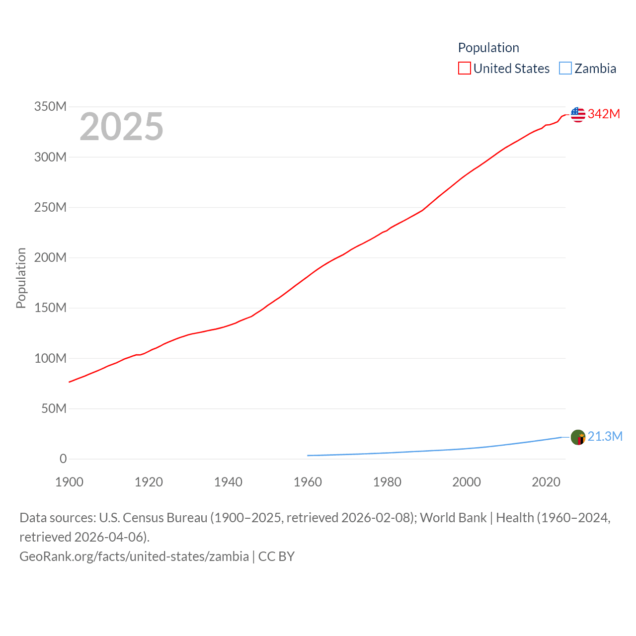 The United States has a population of 342M (ranked 3/197), compared with 21.3M in Zambia (ranked 63/197). The United States' land area is 3,531,839 sq mi versus 287,024 sq mi for Zambia (ranked 3rd vs. 37th).