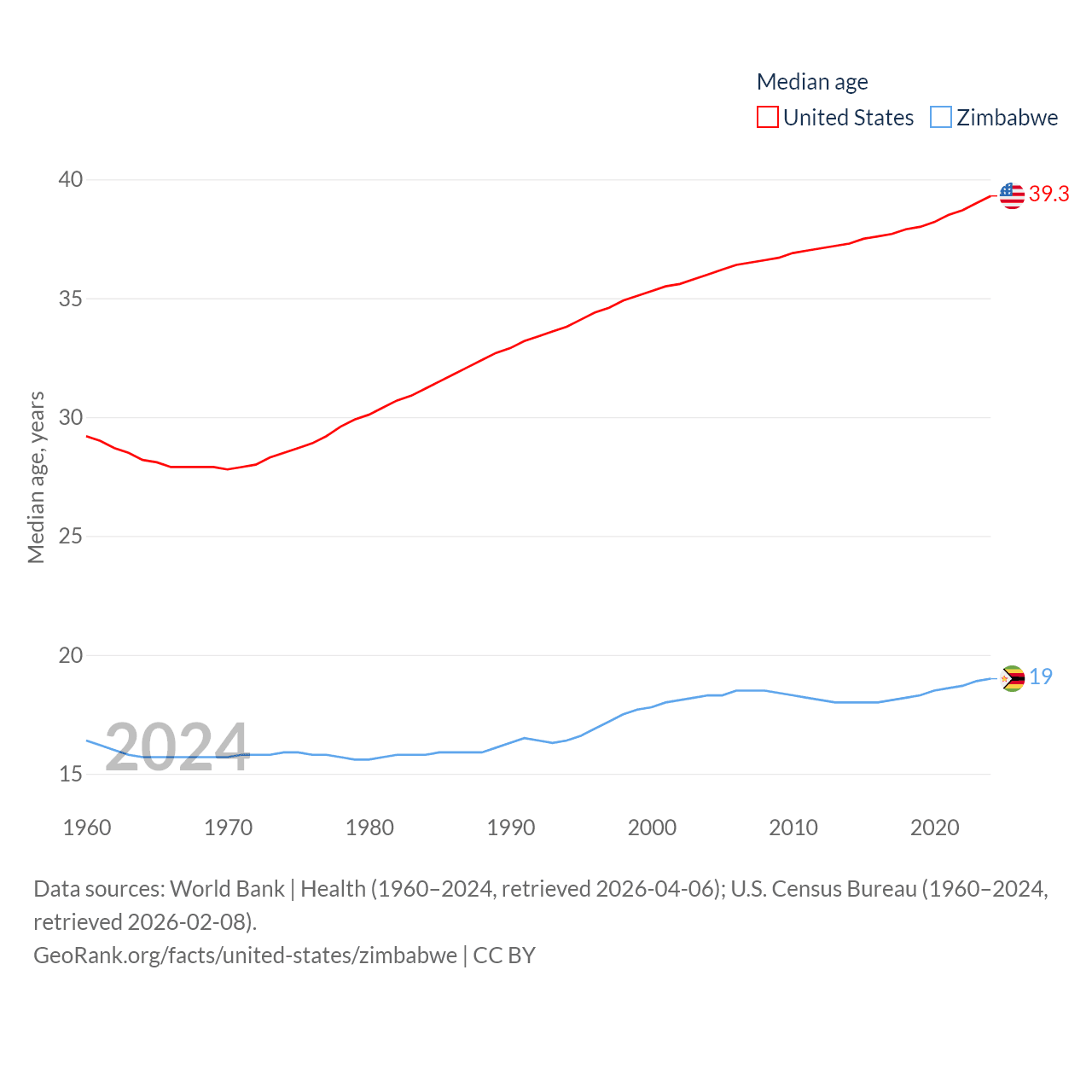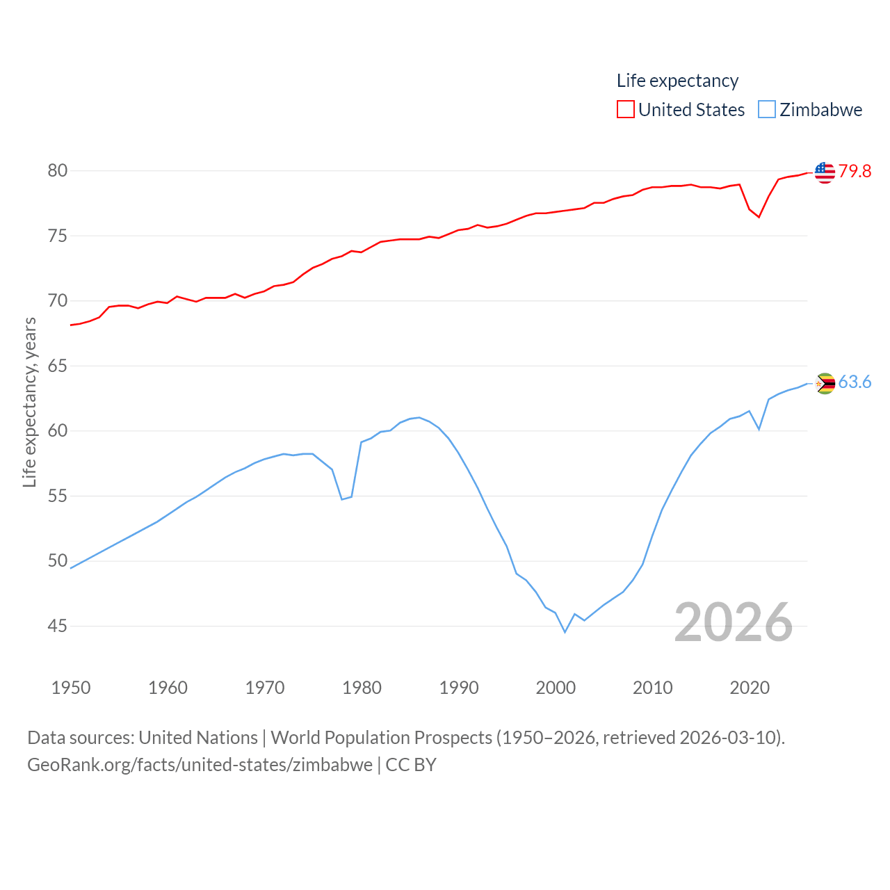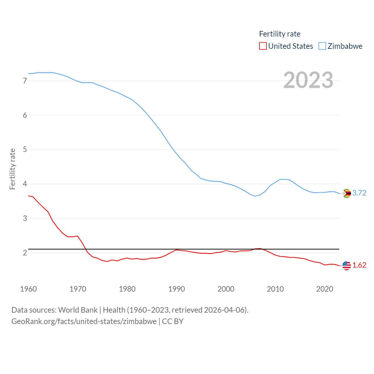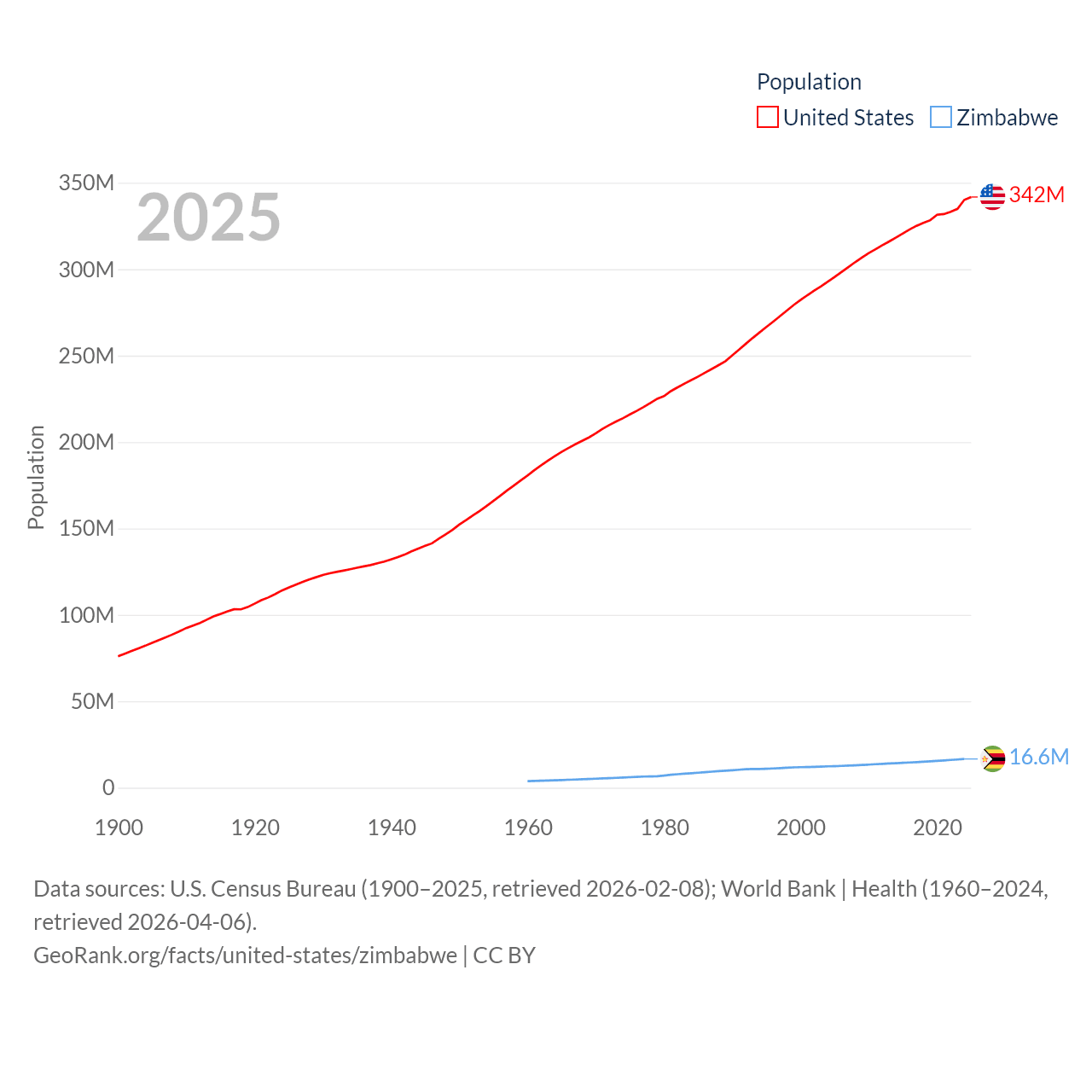 The United States has a population of 342M (ranked 3/197), compared with 16.6M in Zimbabwe (ranked 74/197). The United States' land area is 3,531,839 sq mi versus 149,364 sq mi for Zimbabwe (ranked 3rd vs. 60th).