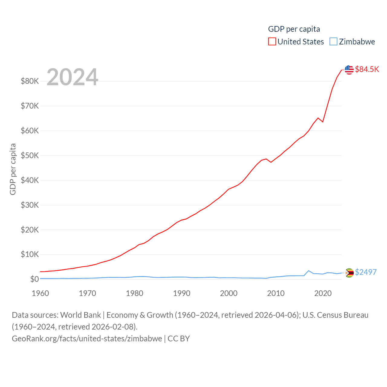 By GDP, The United States ranks 1/197 ($28.8T) and Zimbabwe ranks 102/197 ($41.5B). By GDP per capita, The United States ranks 10/197 ($84,534), while Zimbabwe ranks 148/197 ($2,497).