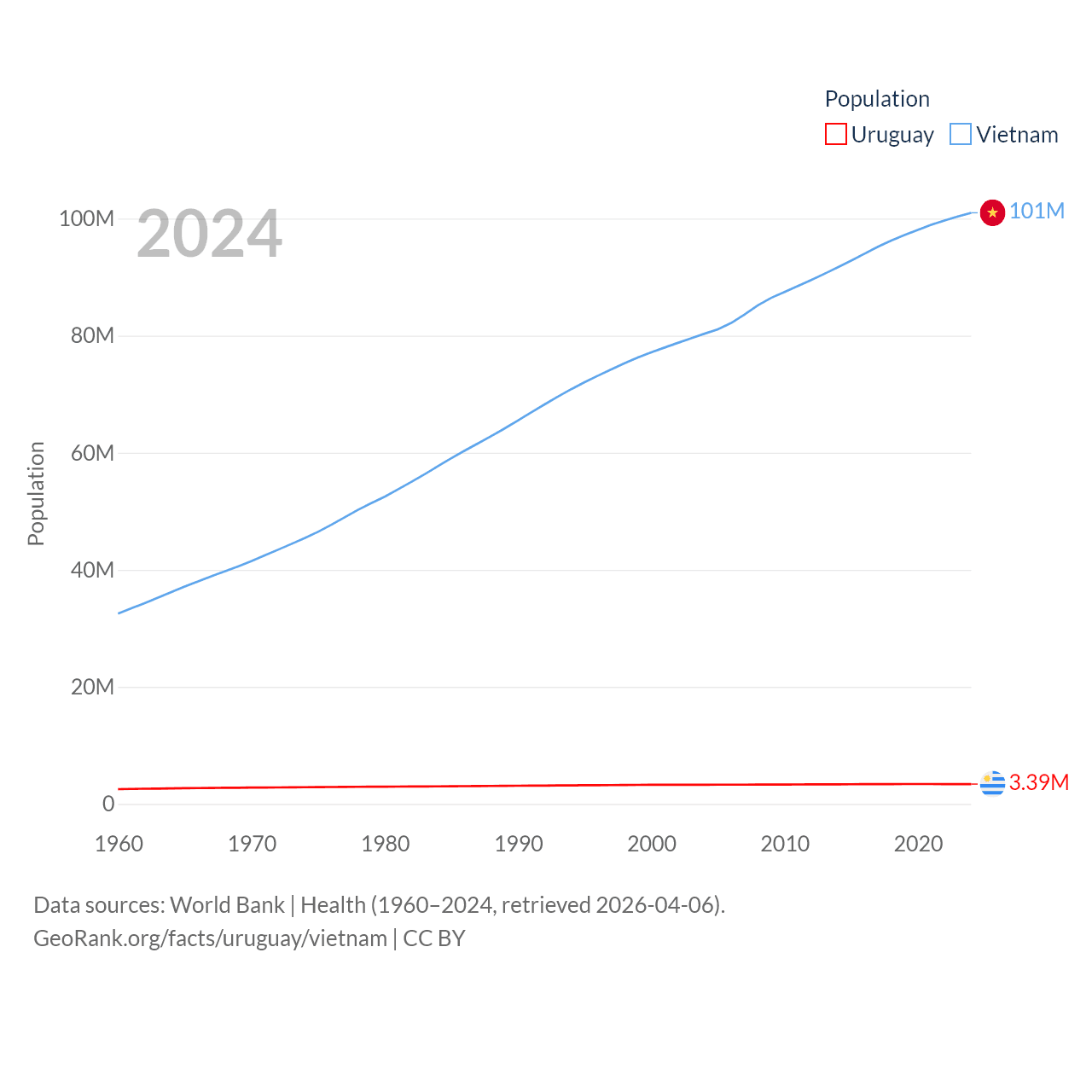 Uruguay has a population of 3.39M (ranked 133/197), compared with 101M in Vietnam (ranked 16/197). Uruguay's land area is 67,576 sq mi versus 121,016 sq mi for Vietnam (ranked 89th vs. 67th).