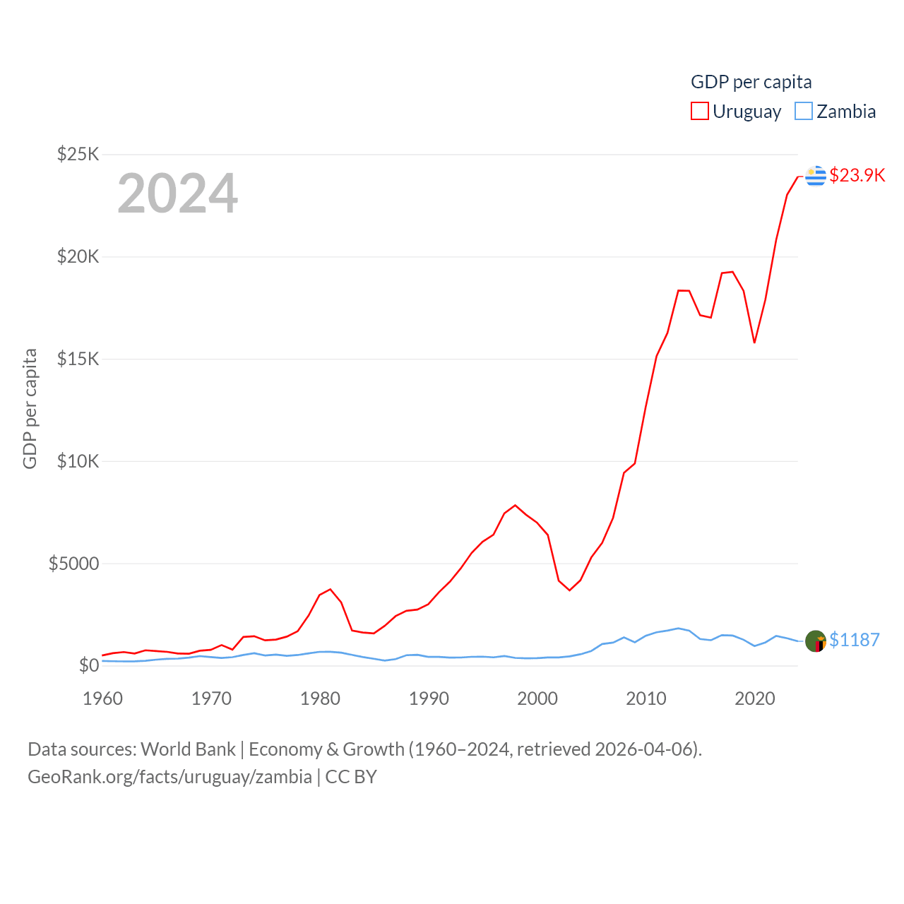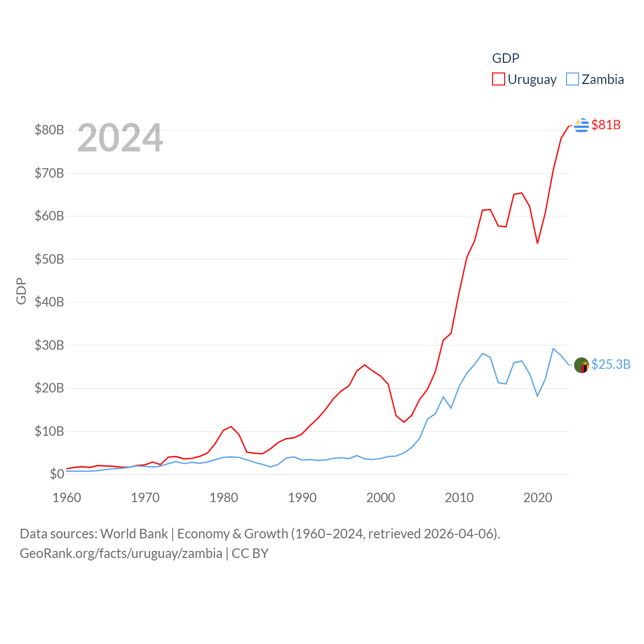 By GDP, Uruguay ranks 81/197 ($81B) and Zambia ranks 116/197 ($25.3B). By GDP per capita, Uruguay ranks 52/197 ($23,907), while Zambia ranks 169/197 ($1,187).