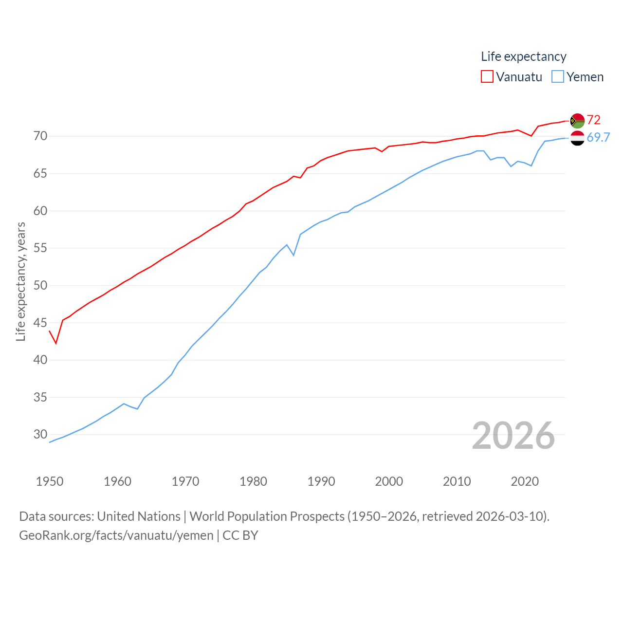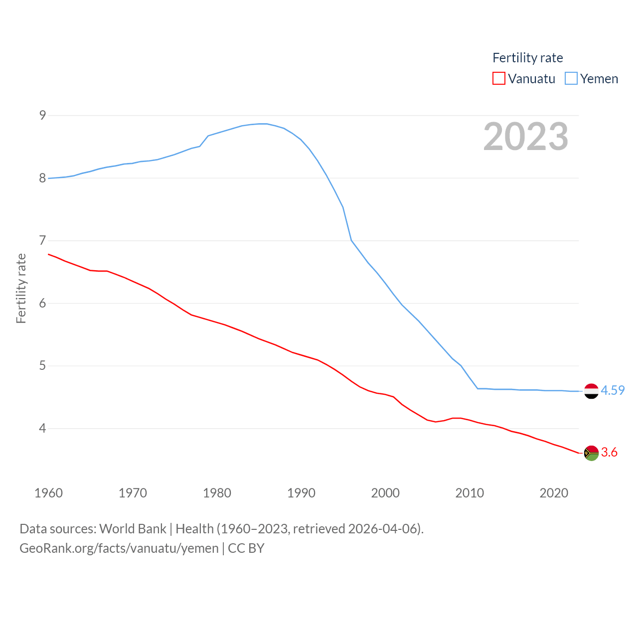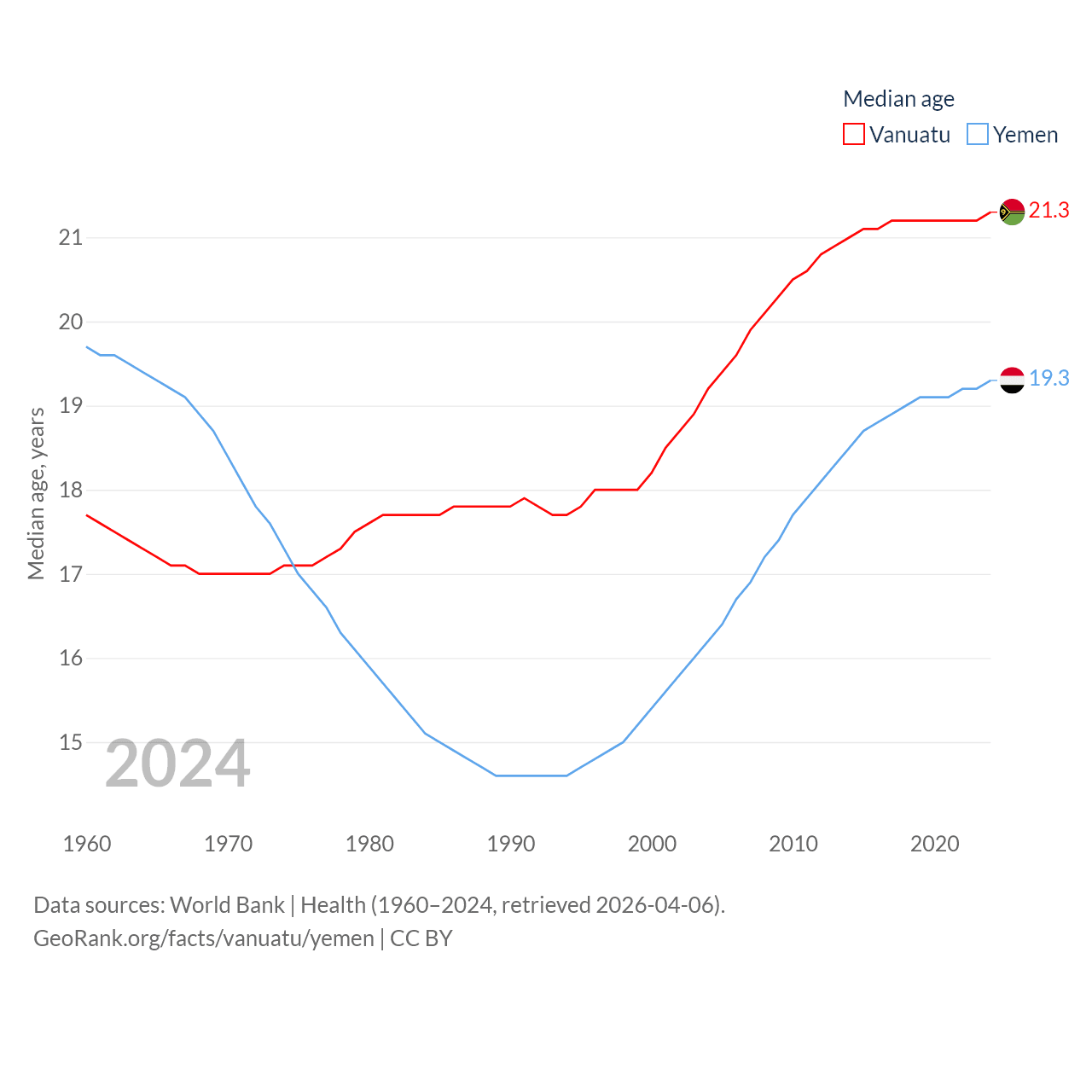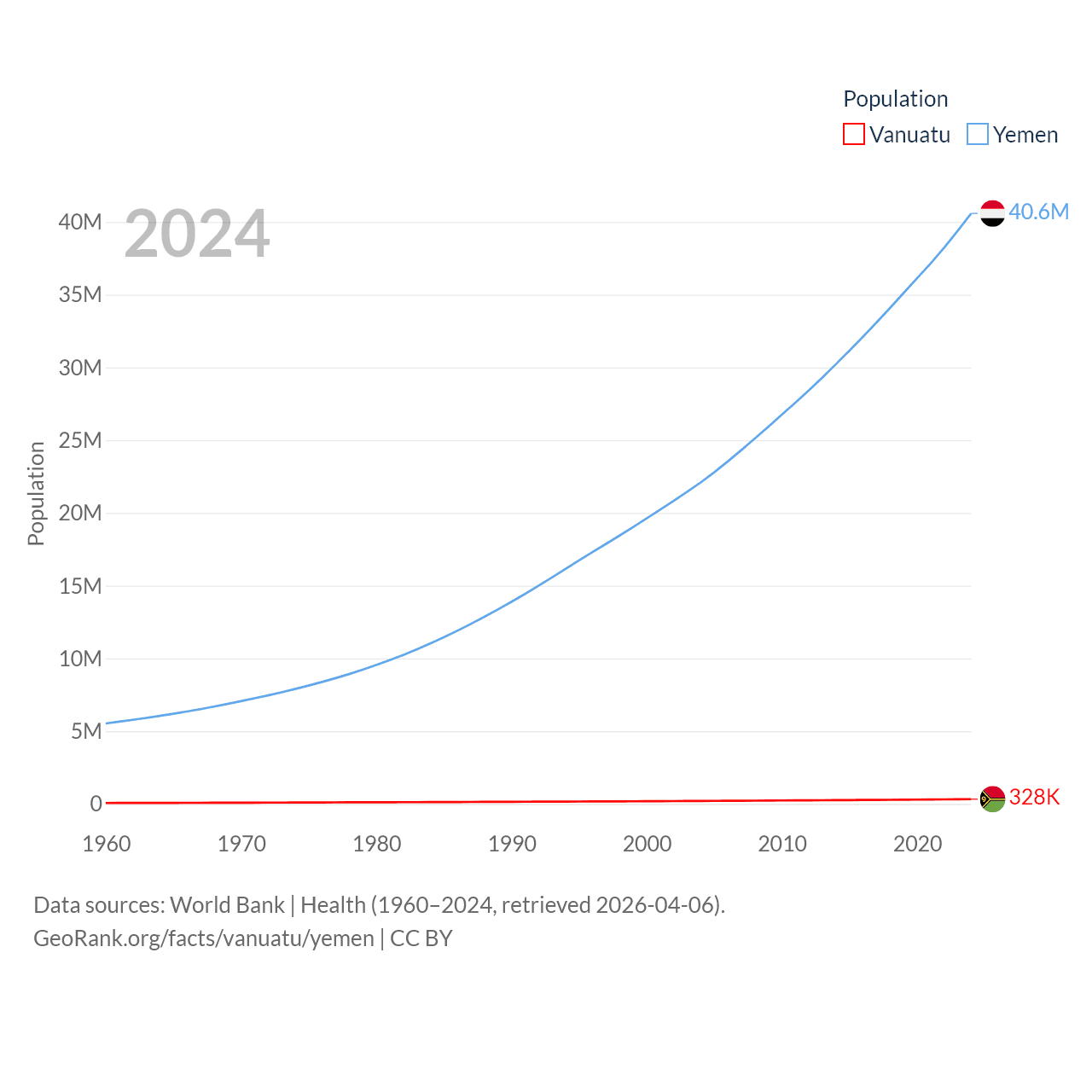Vanuatu has a population of 328K (ranked 174/197), compared with 40.6M in Yemen (ranked 38/197). Vanuatu's land area is 4,707 sq mi versus 203,850 sq mi for Yemen (ranked 157th vs. 49th).