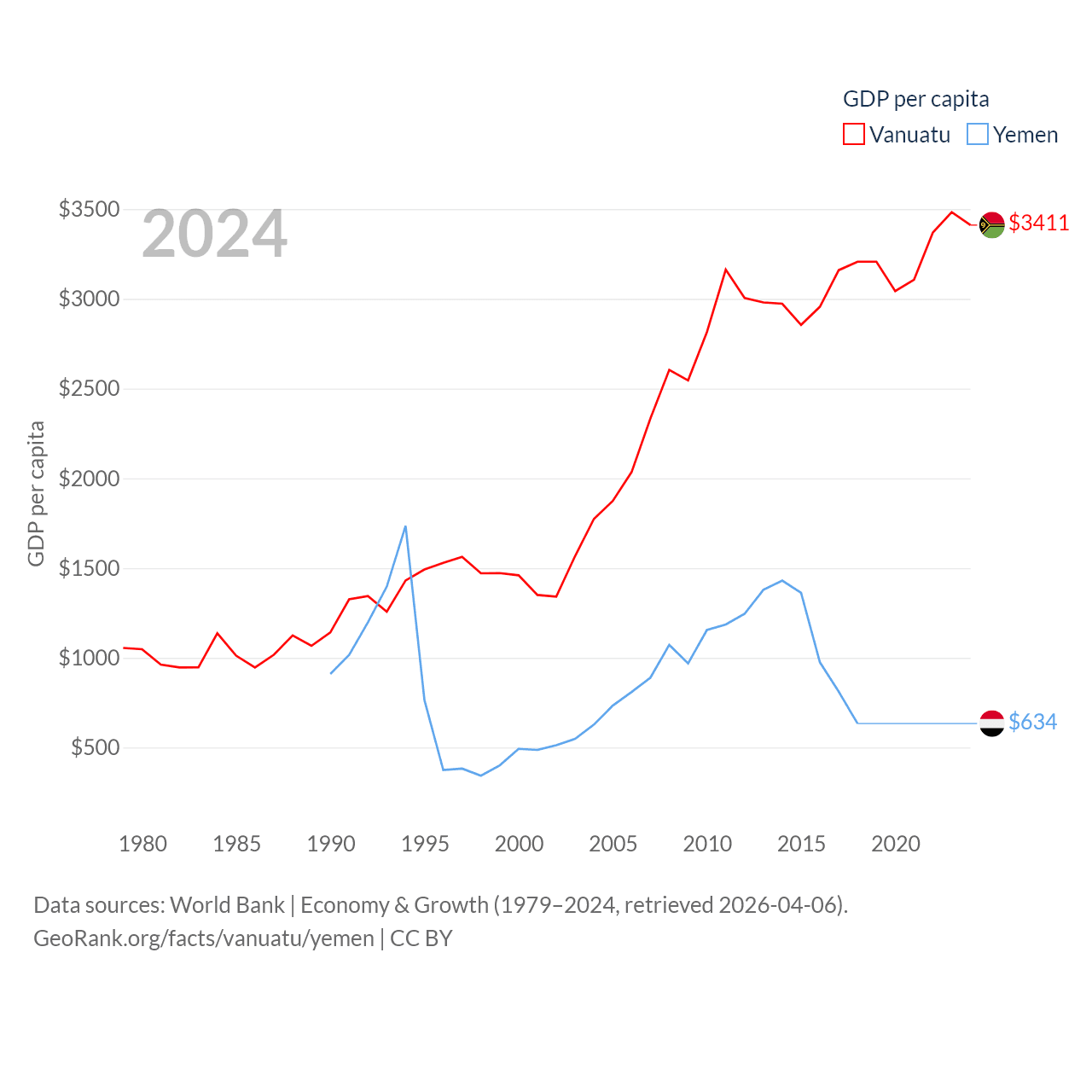 By GDP, Vanuatu ranks 188/197 ($1.12B) and Yemen ranks 125/197 ($21.6B). By GDP per capita, Vanuatu ranks 137/197 ($3,411), while Yemen ranks 191/197 ($634).