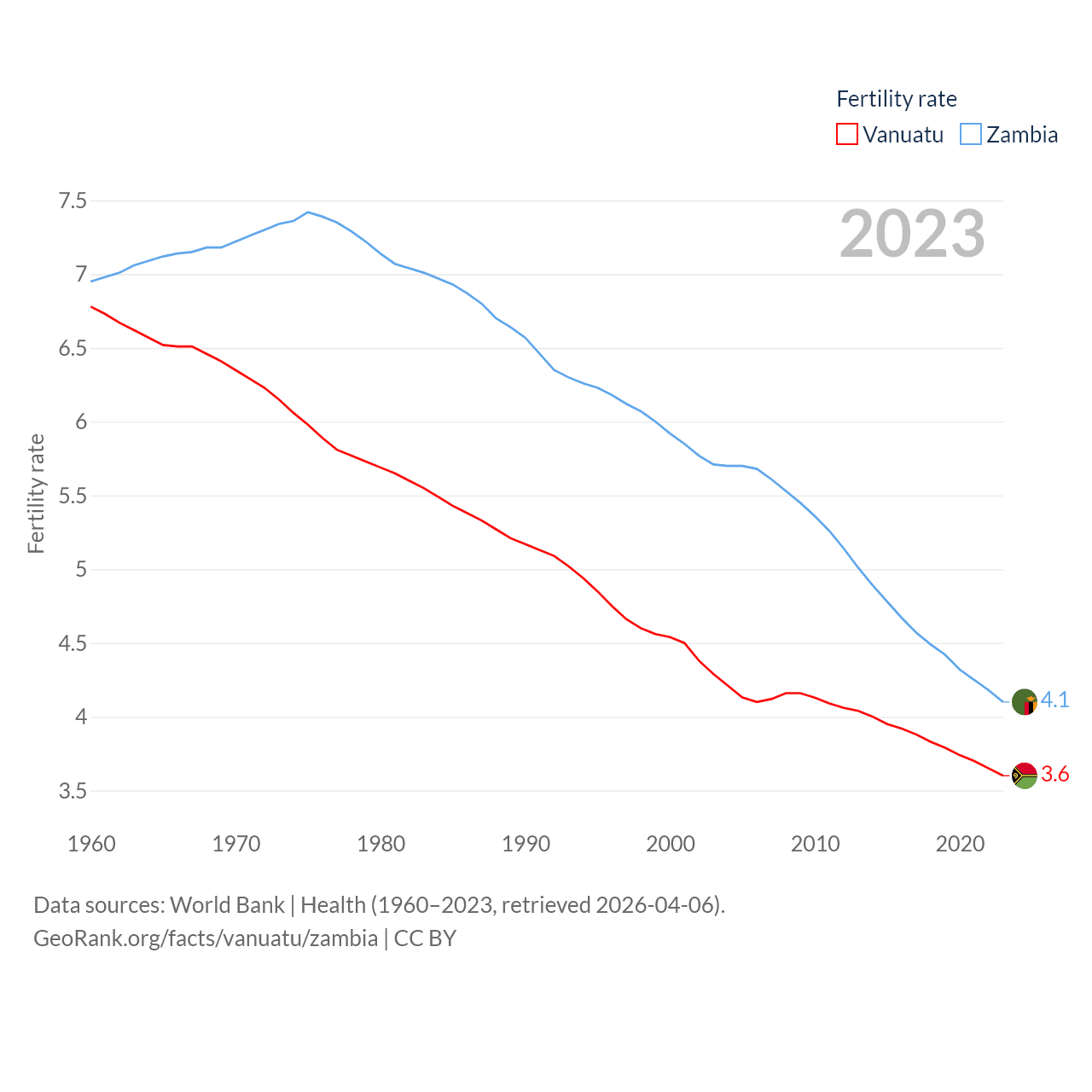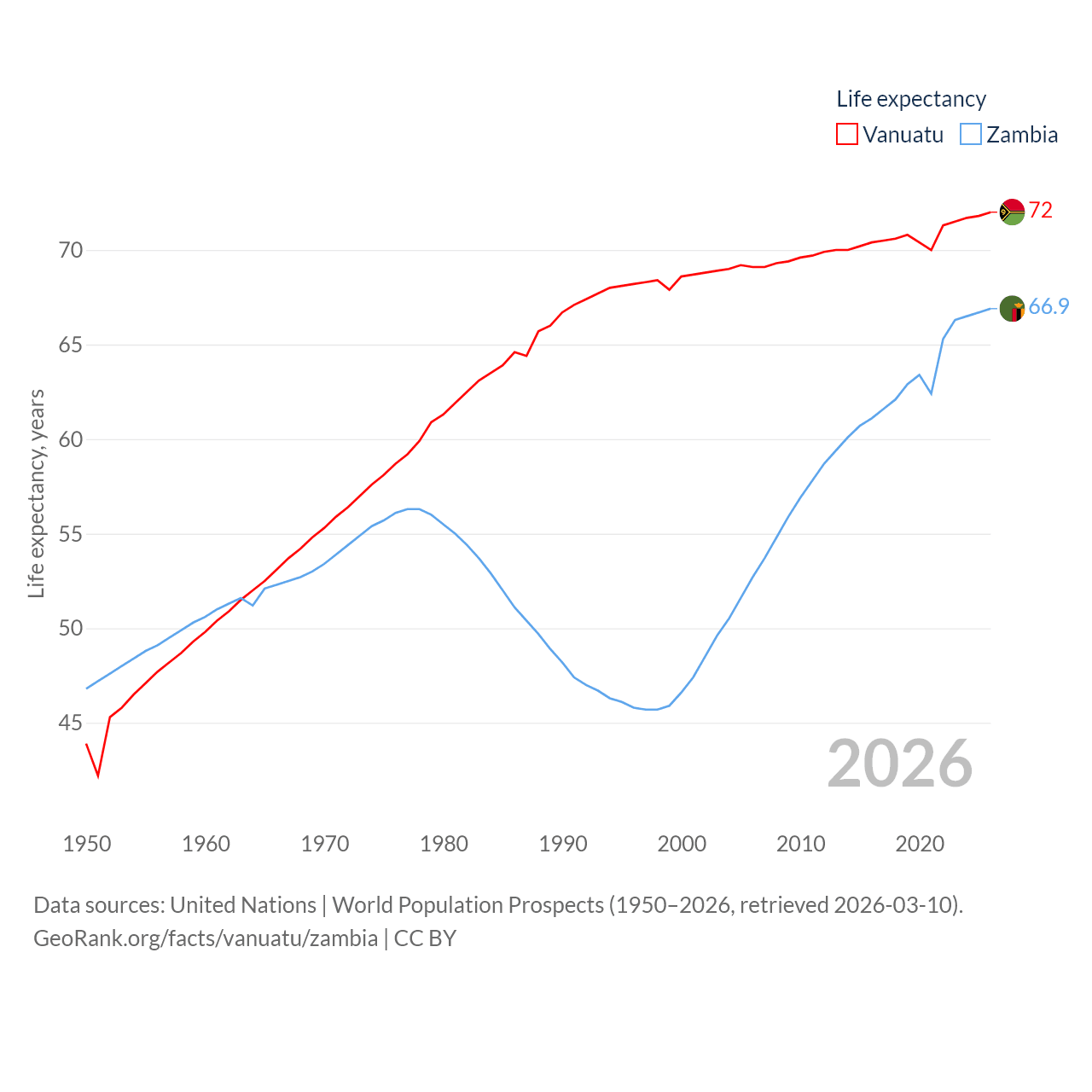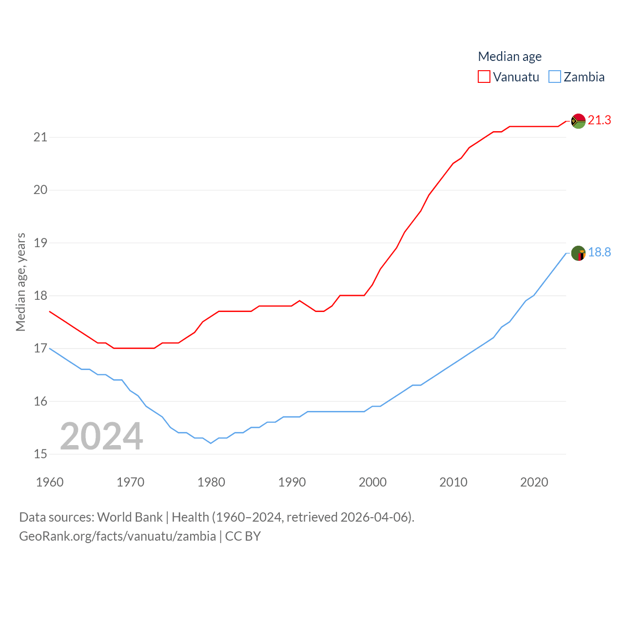 Vanuatu has a population of 328K (ranked 174/197), compared with 21.3M in Zambia (ranked 63/197). Vanuatu's land area is 4,707 sq mi versus 287,024 sq mi for Zambia (ranked 157th vs. 37th).