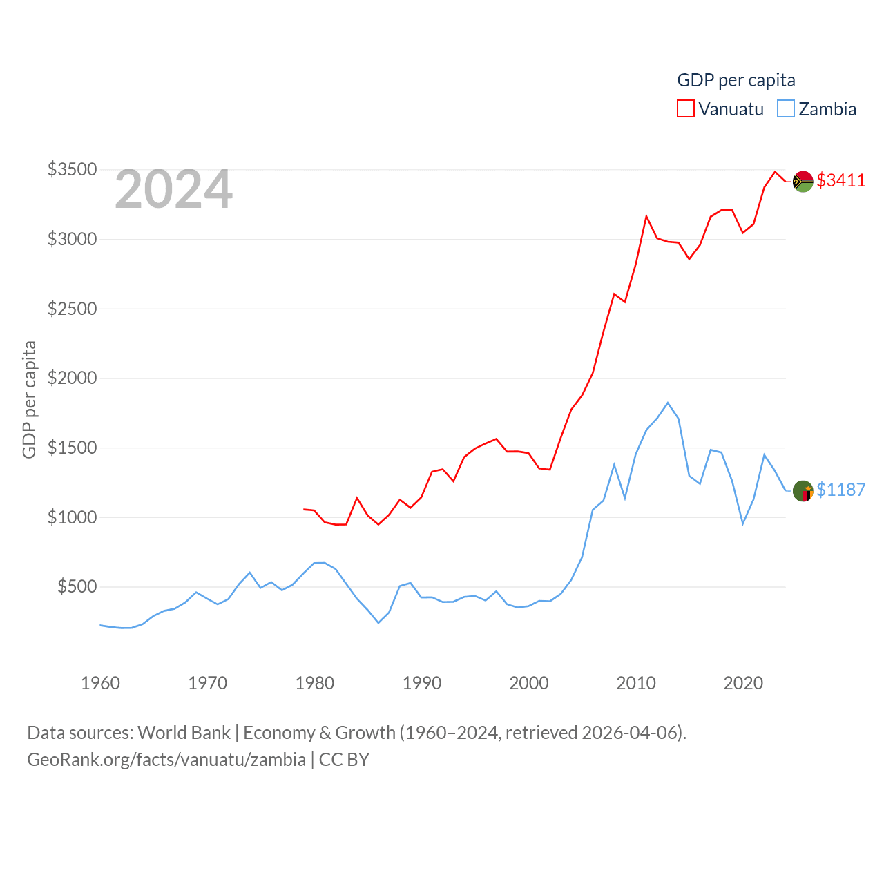 By GDP, Vanuatu ranks 188/197 ($1.12B) and Zambia ranks 116/197 ($25.3B). By GDP per capita, Vanuatu ranks 137/197 ($3,411), while Zambia ranks 169/197 ($1,187).