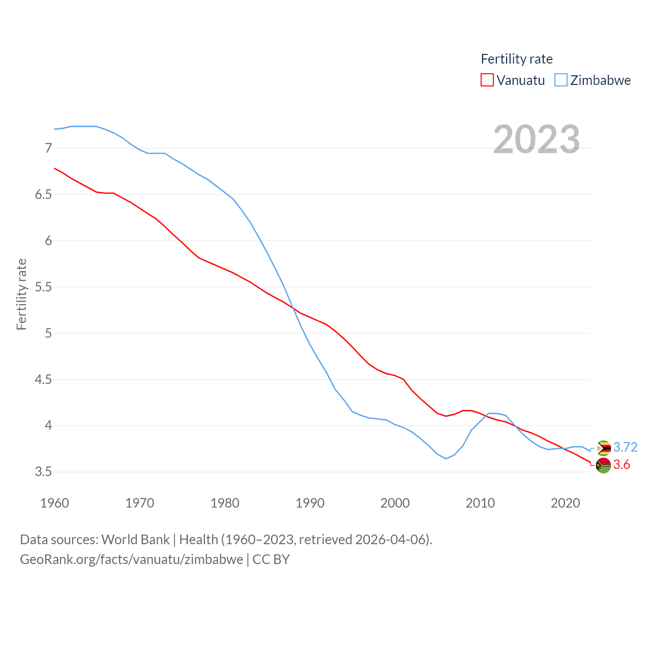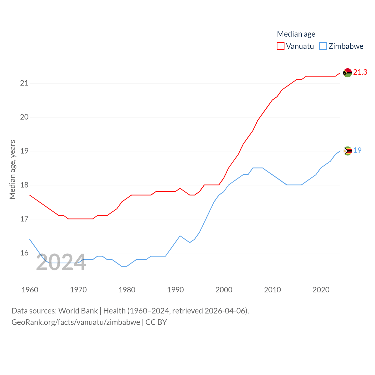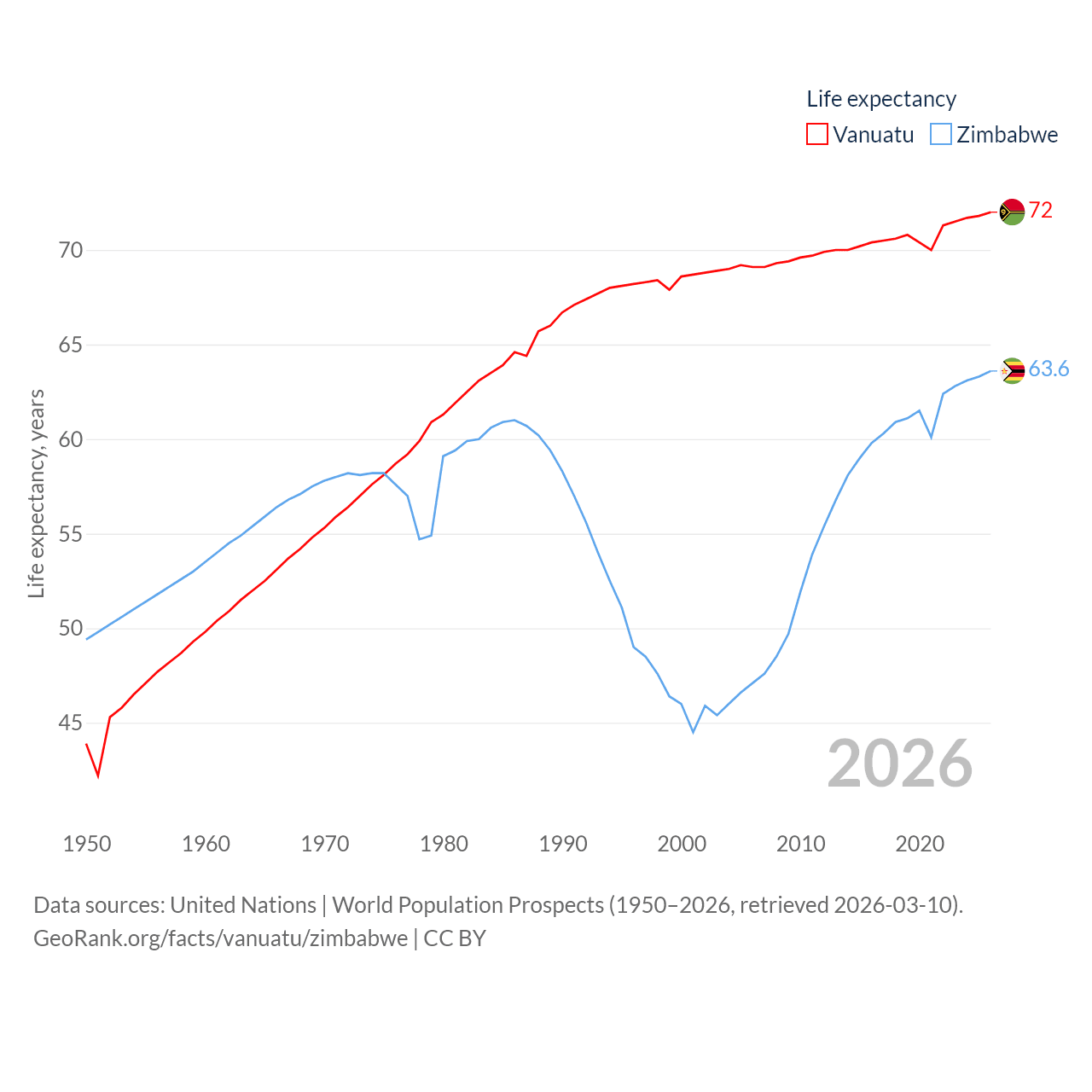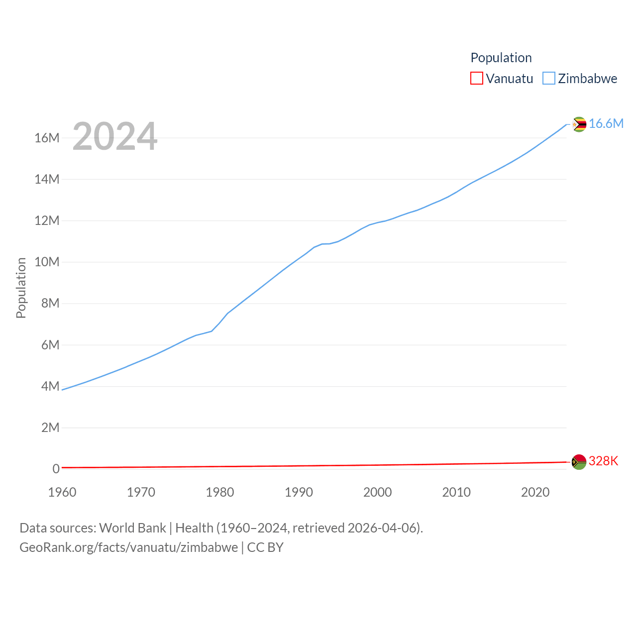 Vanuatu has a population of 328K (ranked 174/197), compared with 16.6M in Zimbabwe (ranked 74/197). Vanuatu's land area is 4,707 sq mi versus 149,364 sq mi for Zimbabwe (ranked 157th vs. 60th).