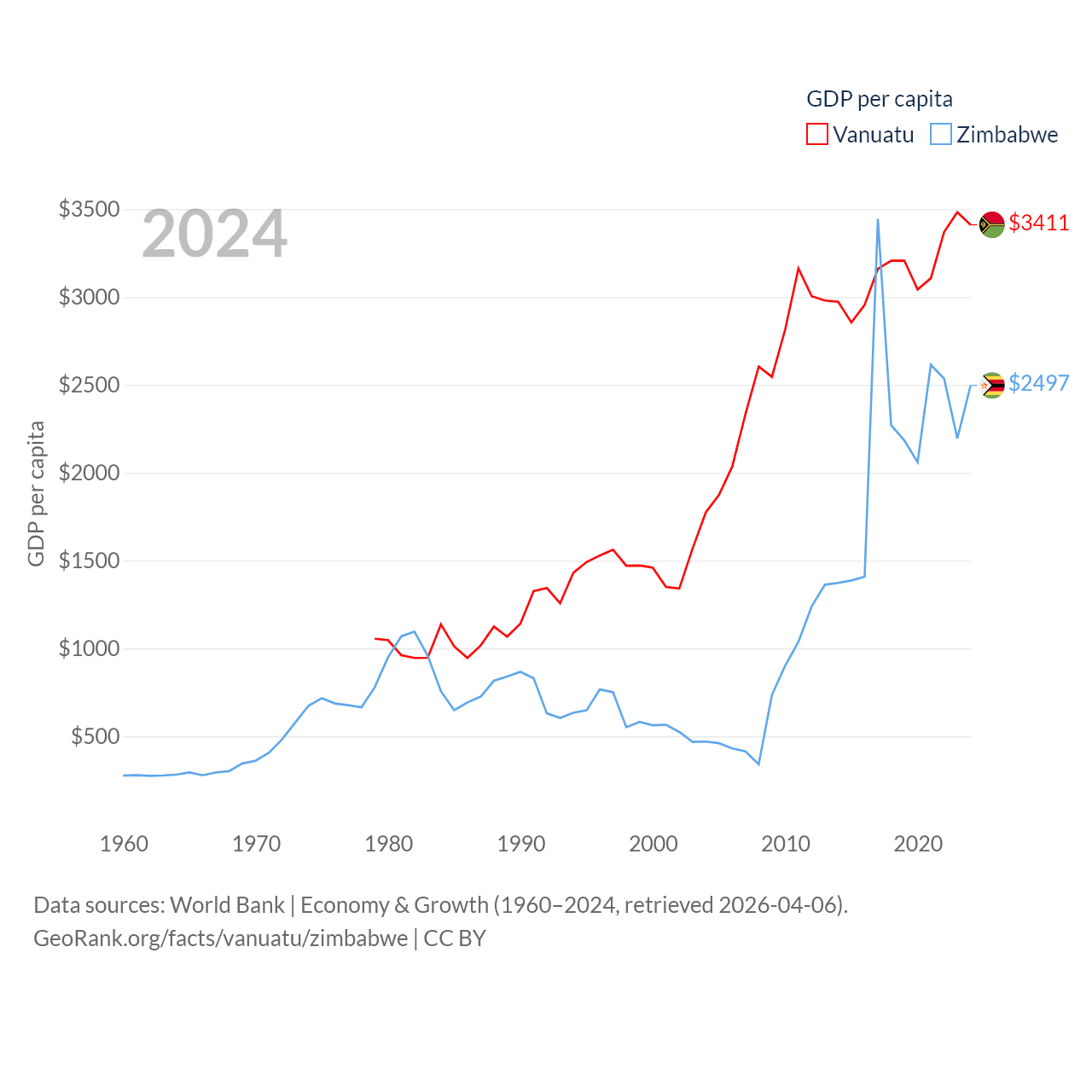 By GDP, Vanuatu ranks 188/197 ($1.12B) and Zimbabwe ranks 102/197 ($41.5B). By GDP per capita, Vanuatu ranks 137/197 ($3,411), while Zimbabwe ranks 148/197 ($2,497).