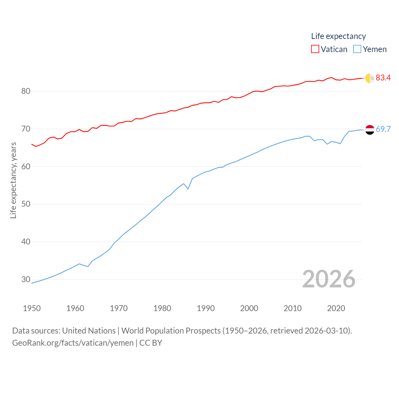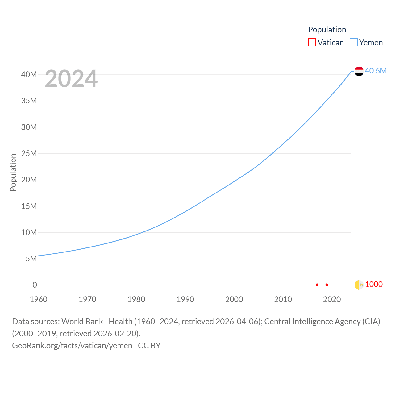 The Vatican has a population of 1K (ranked 197/197), compared with 40.6M in Yemen (ranked 38/197). The Vatican's land area is 0.17 sq mi versus 203,850 sq mi for Yemen (ranked 197th vs. 49th).