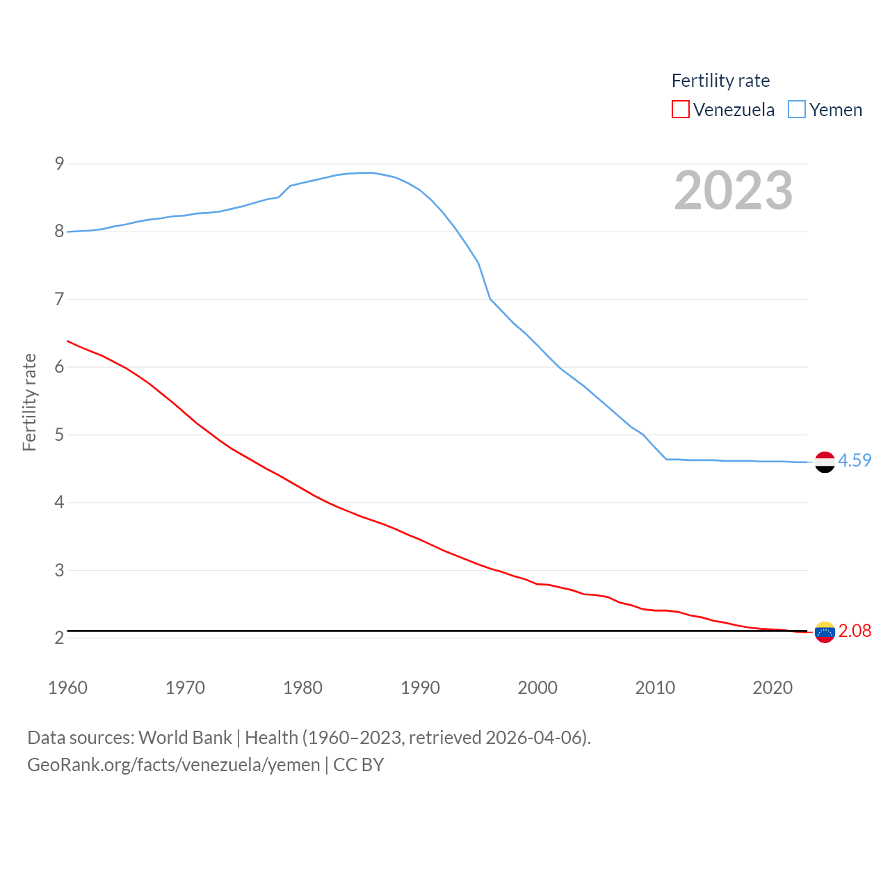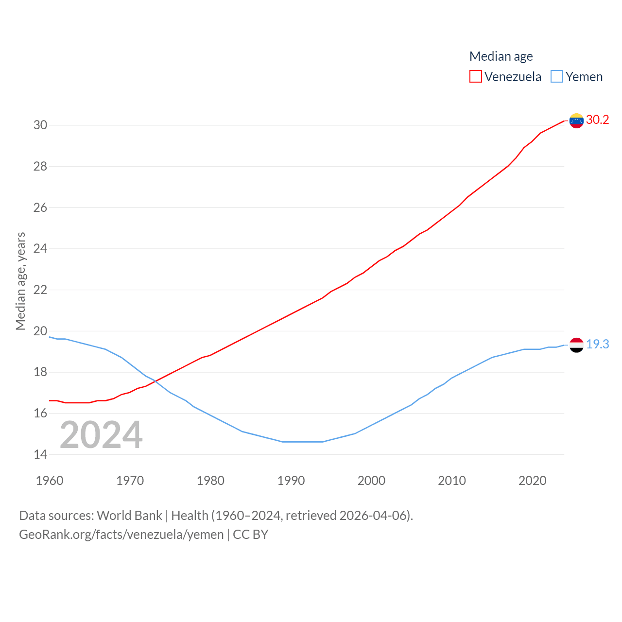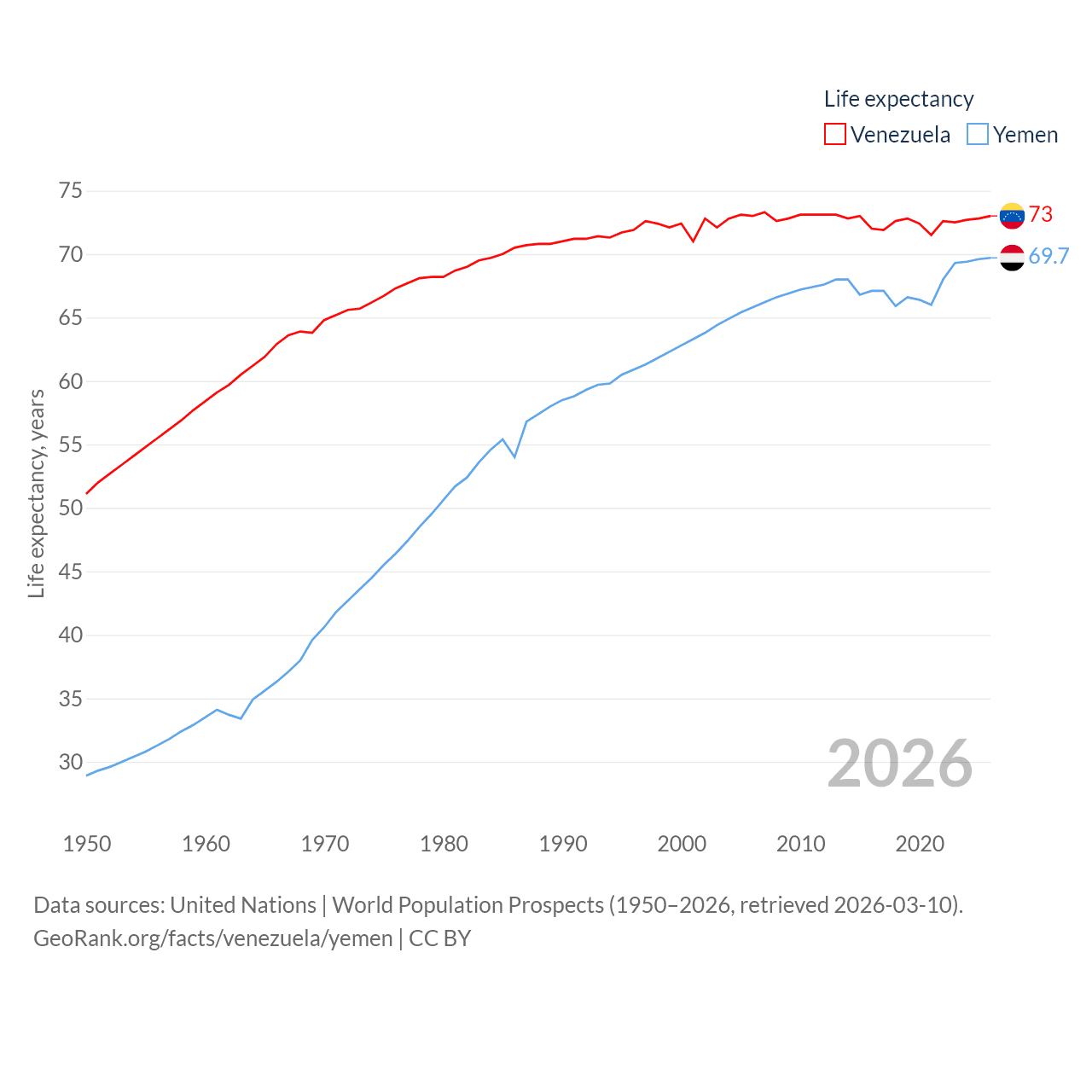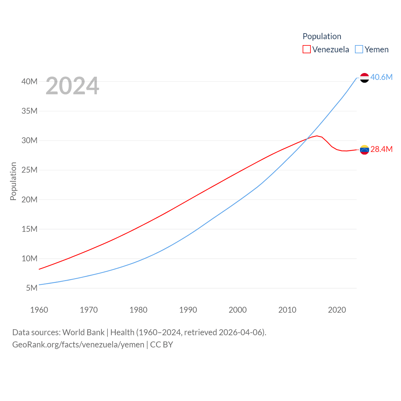 Venezuela has a population of 28.4M (ranked 53/197), compared with 40.6M in Yemen (ranked 38/197). Venezuela's land area is 340,561 sq mi versus 203,850 sq mi for Yemen (ranked 32nd vs. 49th).