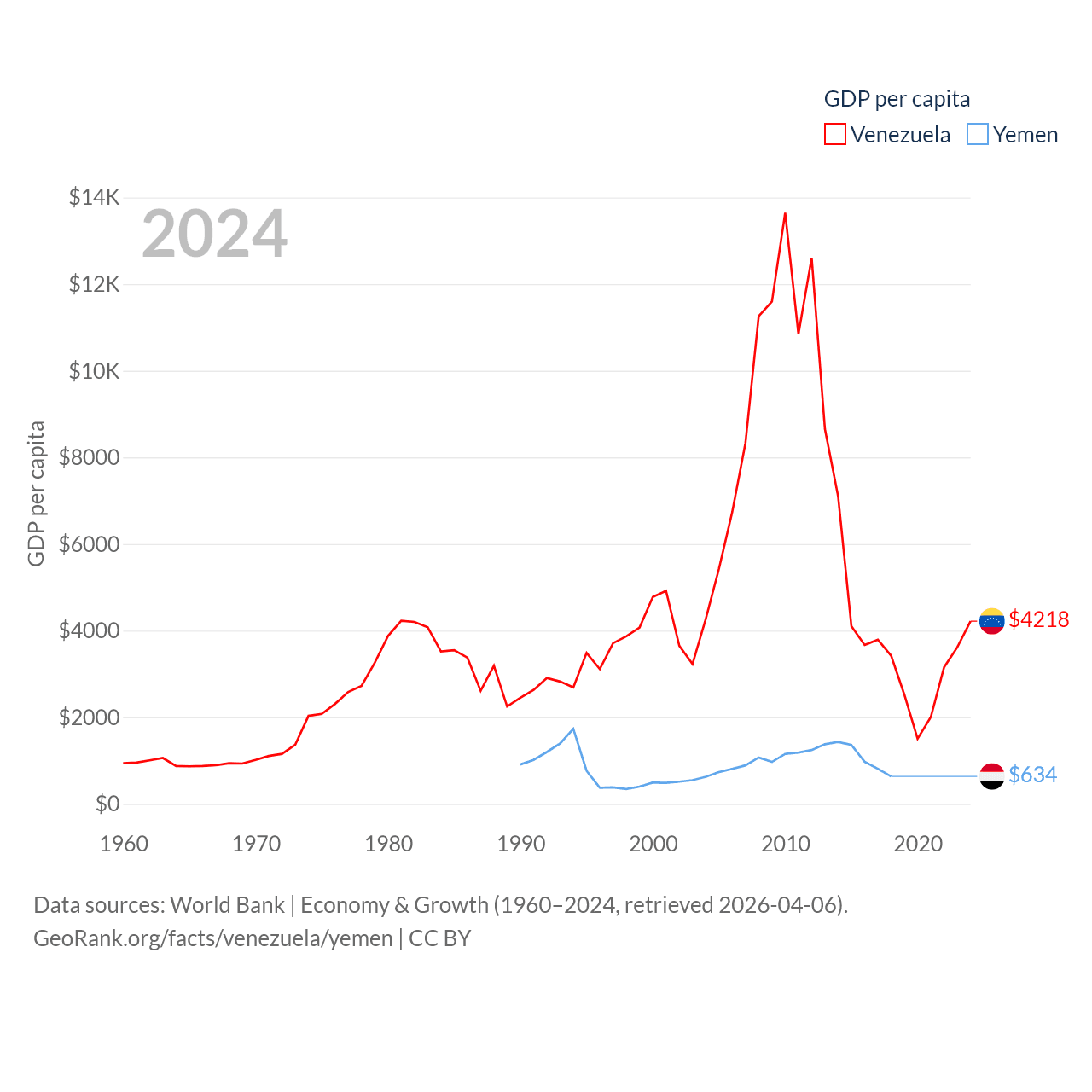 By GDP, Venezuela ranks 65/197 ($120B) and Yemen ranks 125/197 ($21.6B). By GDP per capita, Venezuela ranks 128/197 ($4,218), while Yemen ranks 191/197 ($634).