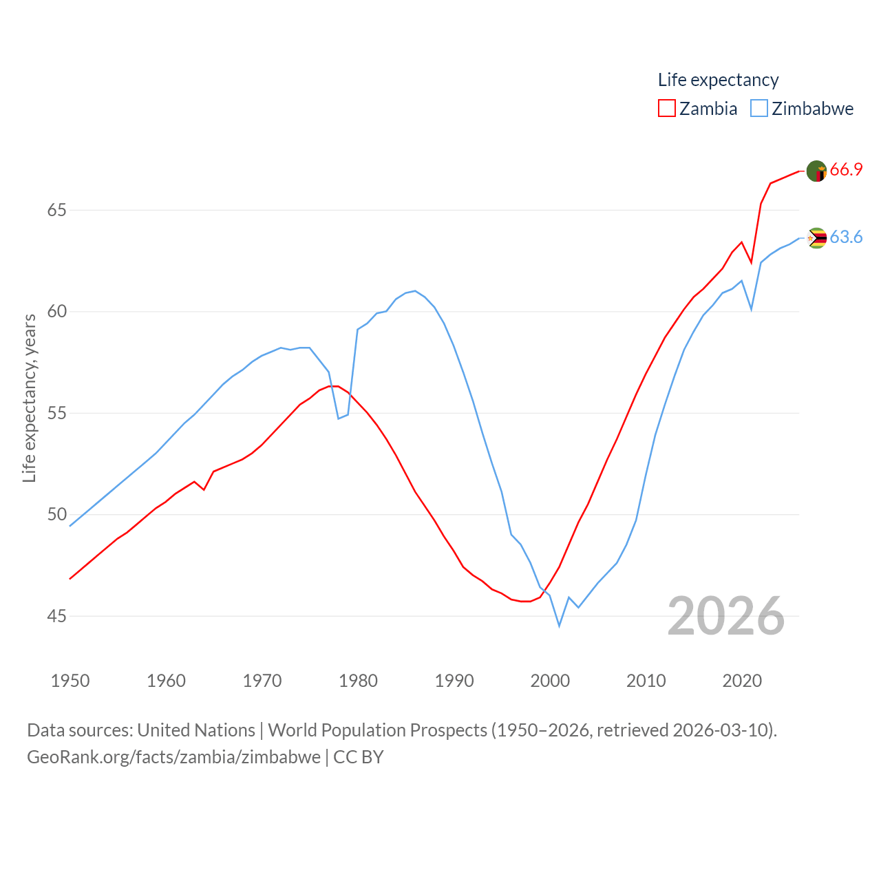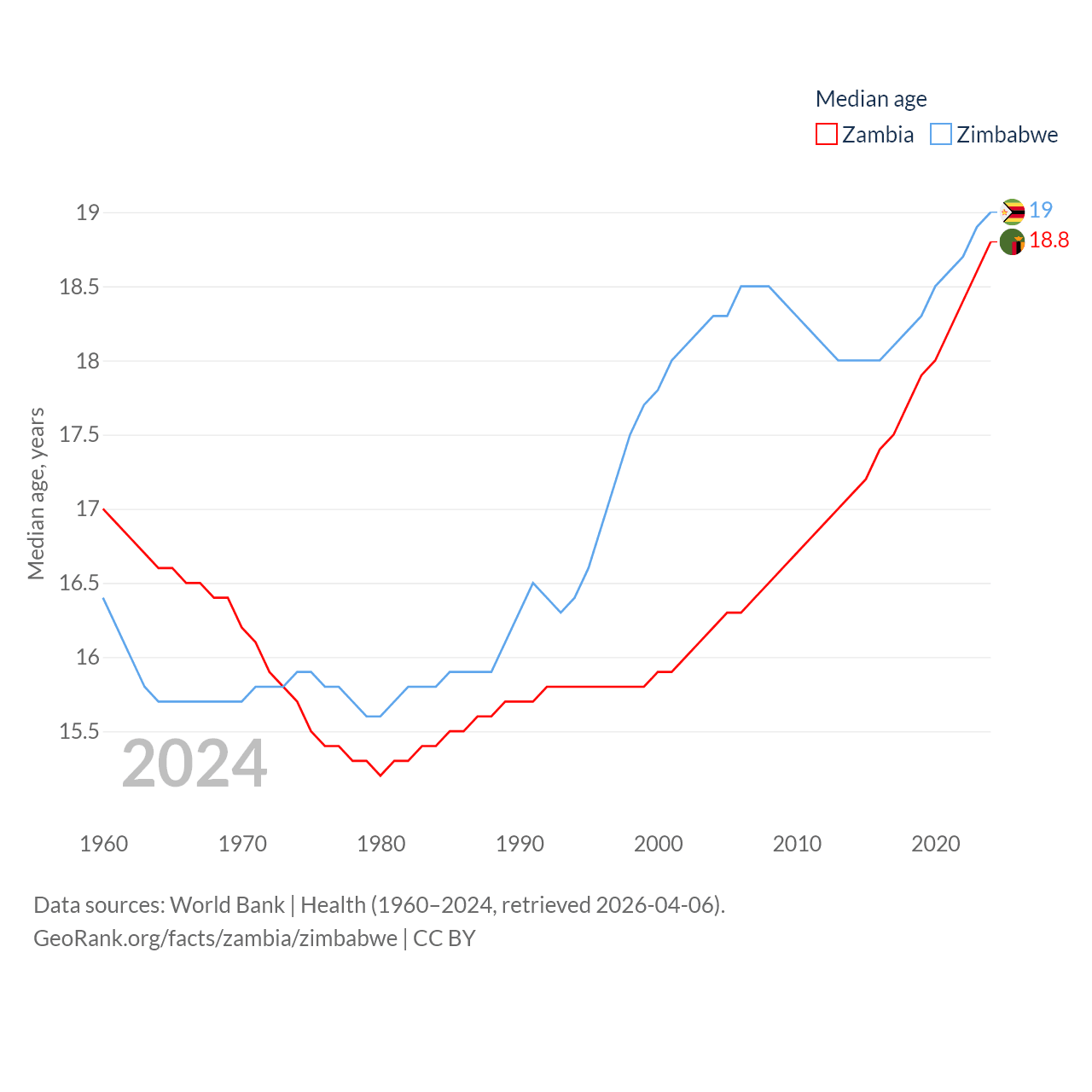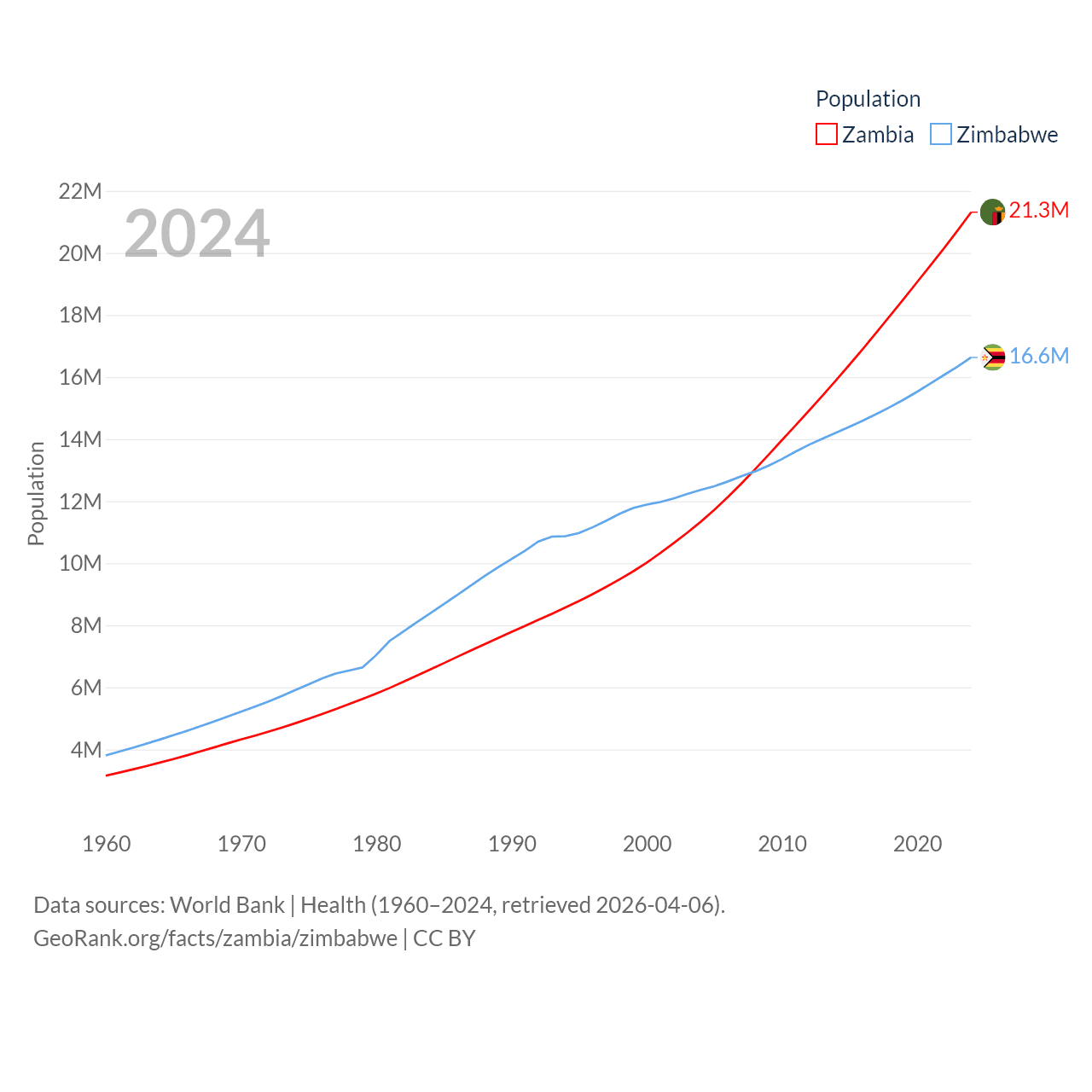 Zambia has a population of 21.3M (ranked 63/197), compared with 16.6M in Zimbabwe (ranked 74/197). Zambia's land area is 287,024 sq mi versus 149,364 sq mi for Zimbabwe (ranked 37th vs. 60th).