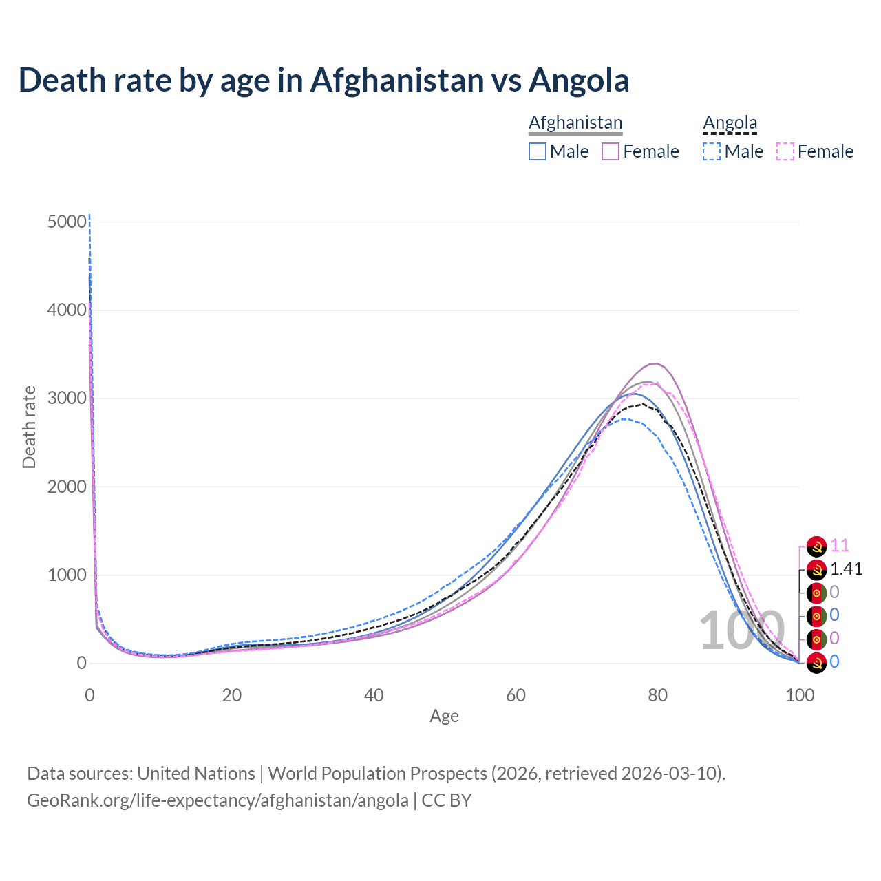 In Afghanistan, the most common age of death is 0, compared to 0 in Angola. The median age of death is 73 in Afghanistan and 71.9 in Angola, meaning only half of each cohort is expected to live past that age.