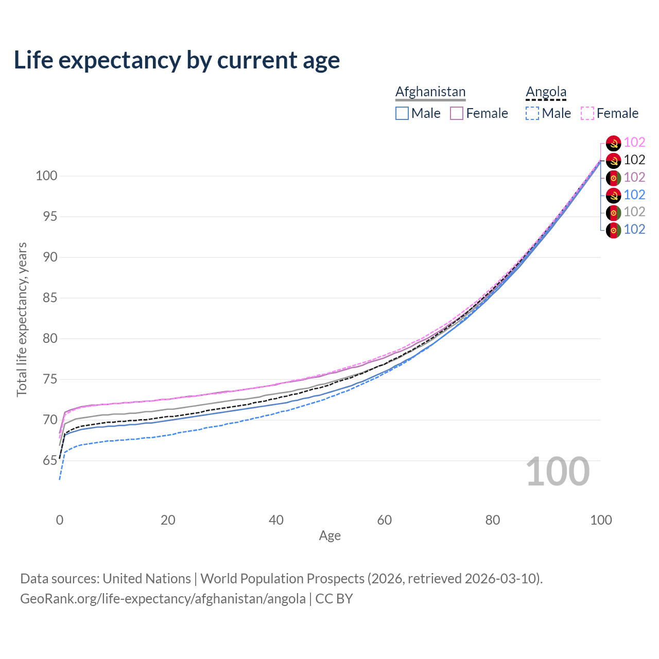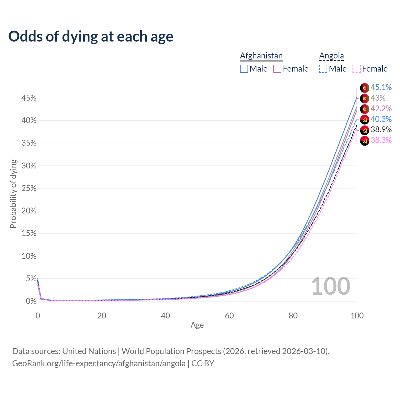 This life expectancy calculator shows the odds of living to 100, 95, 90, and below based on current age for both males and females in Afghanistan and Angola, along with mean and median age of death. The calculations are based on the 2026 life tables (actuarial tables) from the UN World Population Prospects.