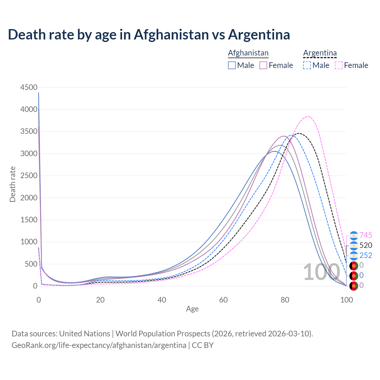 In Afghanistan, the most common age of death is 0, compared to 85 in Argentina. The median age of death is 73 in Afghanistan and 81.4 in Argentina, meaning only half of each cohort is expected to live past that age.