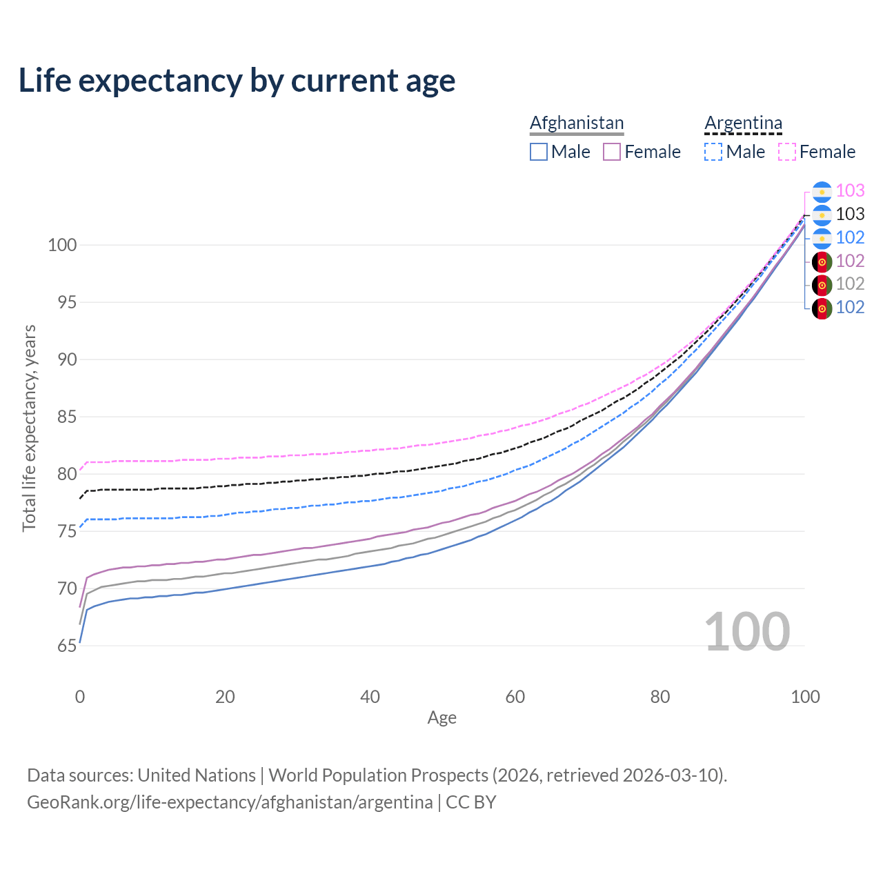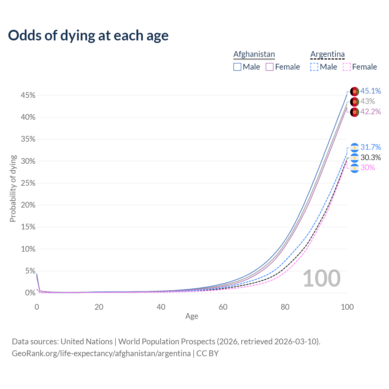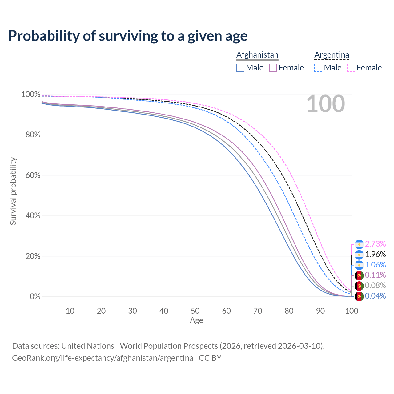 This life expectancy calculator shows the odds of living to 100, 95, 90, and below based on current age for both males and females in Afghanistan and Argentina, along with mean and median age of death. The calculations are based on the 2026 life tables (actuarial tables) from the UN World Population Prospects.