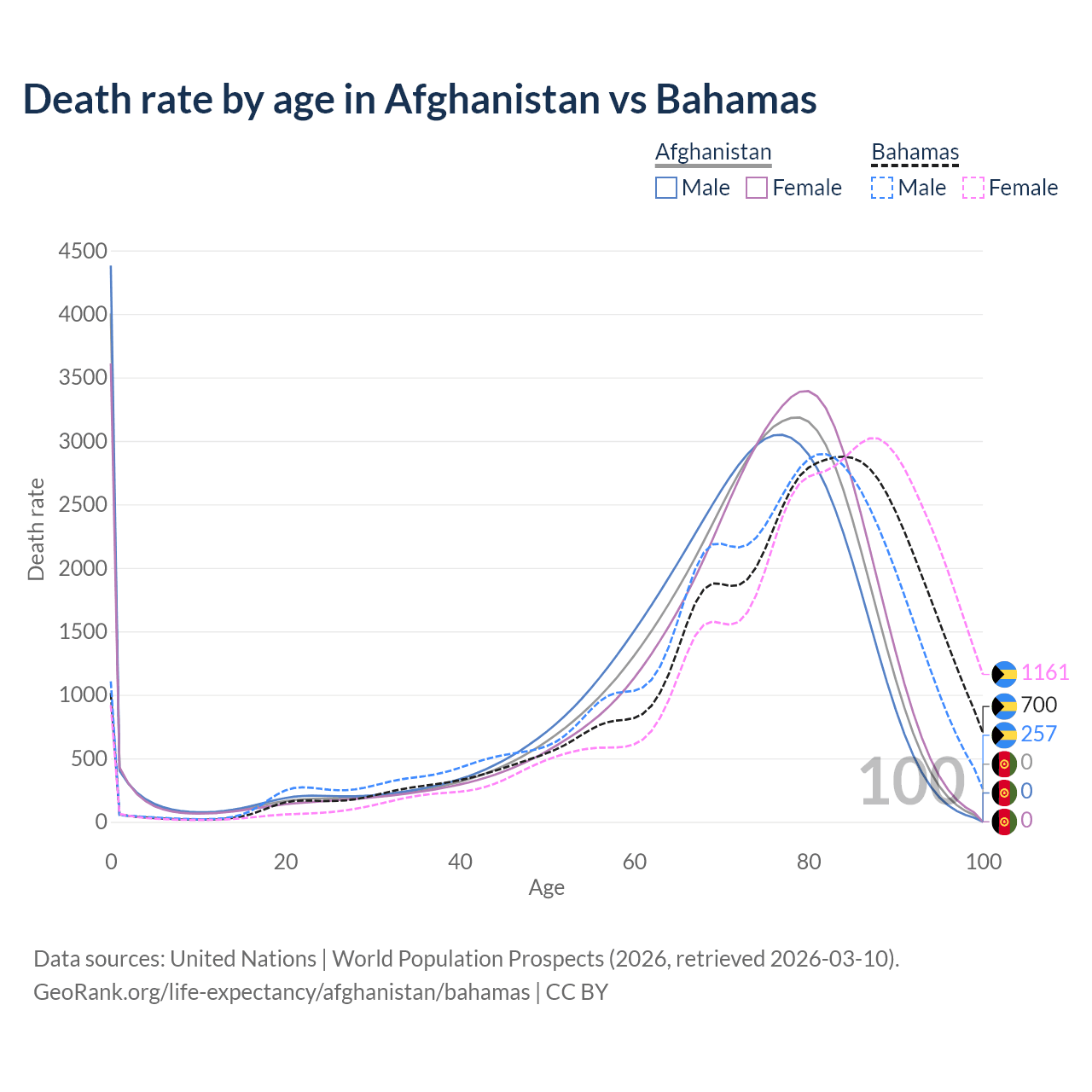 In Afghanistan, the most common age of death is 0, compared to 84 in the Bahamas. The median age of death is 73 in Afghanistan and 79.2 in the Bahamas, meaning only half of each cohort is expected to live past that age.