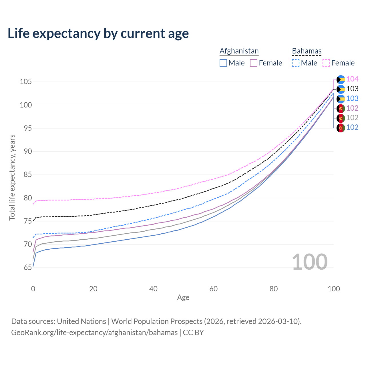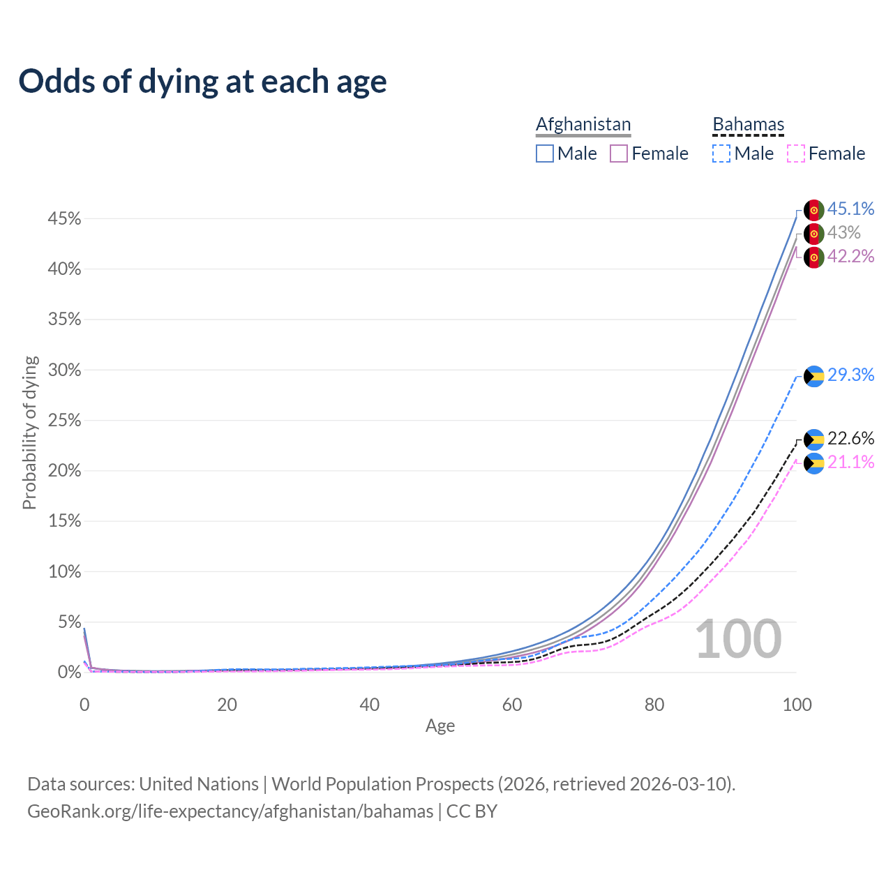 This life expectancy calculator shows the odds of living to 100, 95, 90, and below based on current age for both males and females in Afghanistan and the Bahamas, along with mean and median age of death. The calculations are based on the 2026 life tables (actuarial tables) from the UN World Population Prospects.