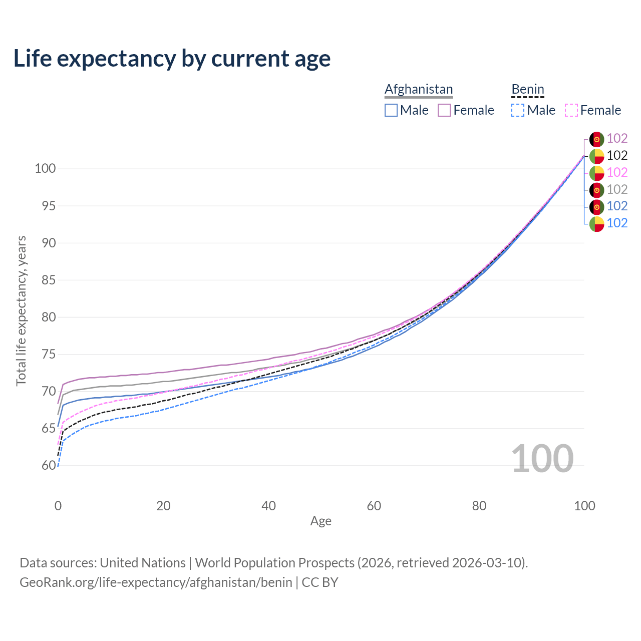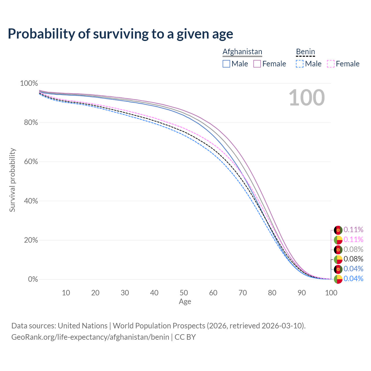 This life expectancy calculator shows the odds of living to 100, 95, 90, and below based on current age for both males and females in Afghanistan and Benin, along with mean and median age of death. The calculations are based on the 2026 life tables (actuarial tables) from the UN World Population Prospects.