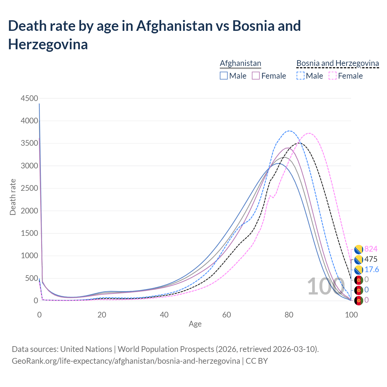 In Afghanistan, the most common age of death is 0, compared to 83 in Bosnia and Herzegovina. The median age of death is 73 in Afghanistan and 80.7 in Bosnia and Herzegovina, meaning only half of each cohort is expected to live past that age.
