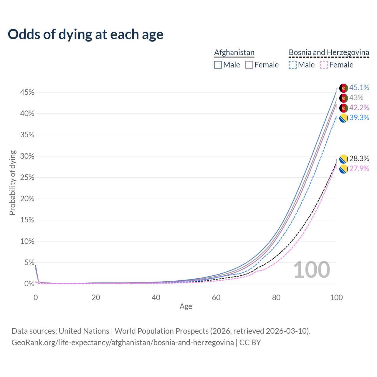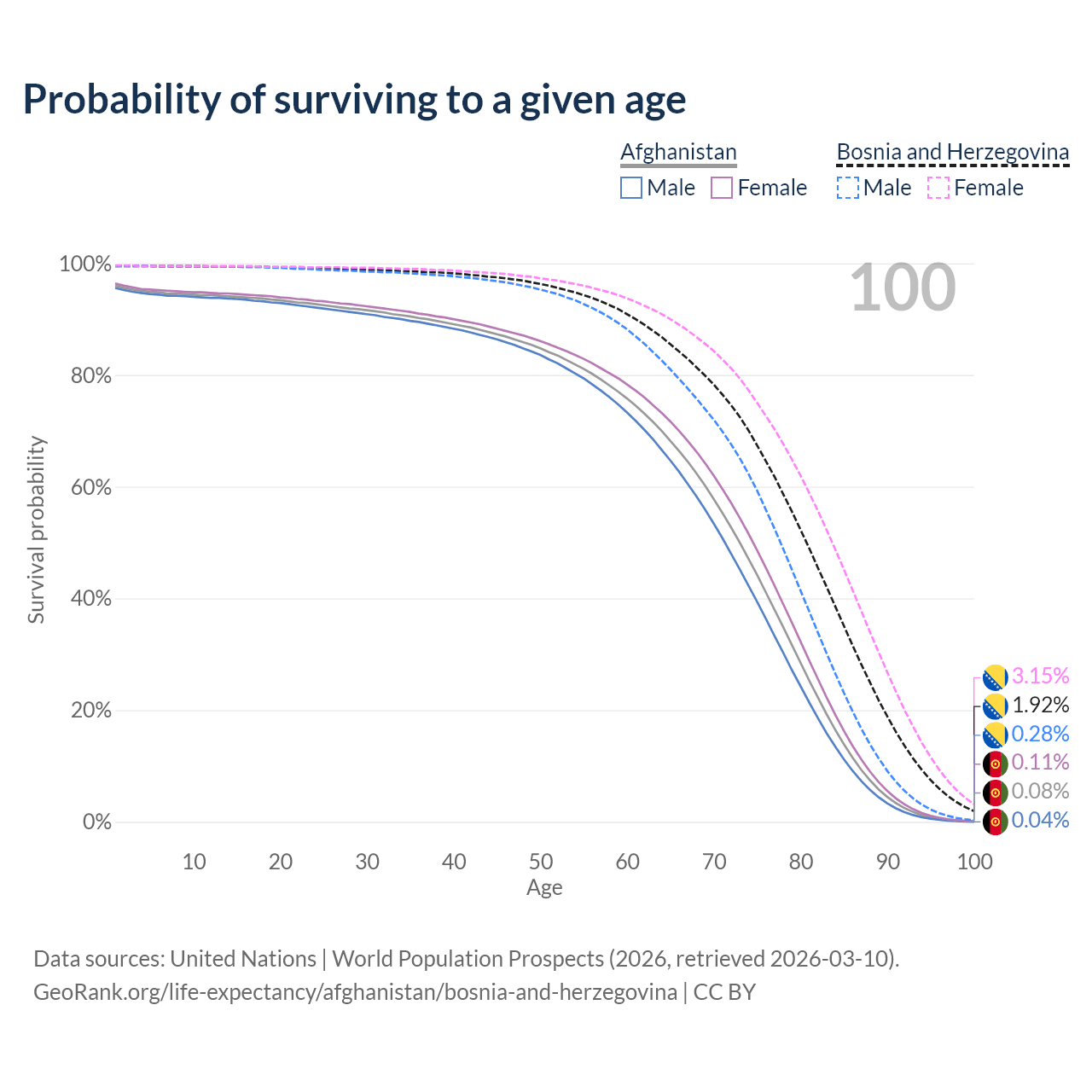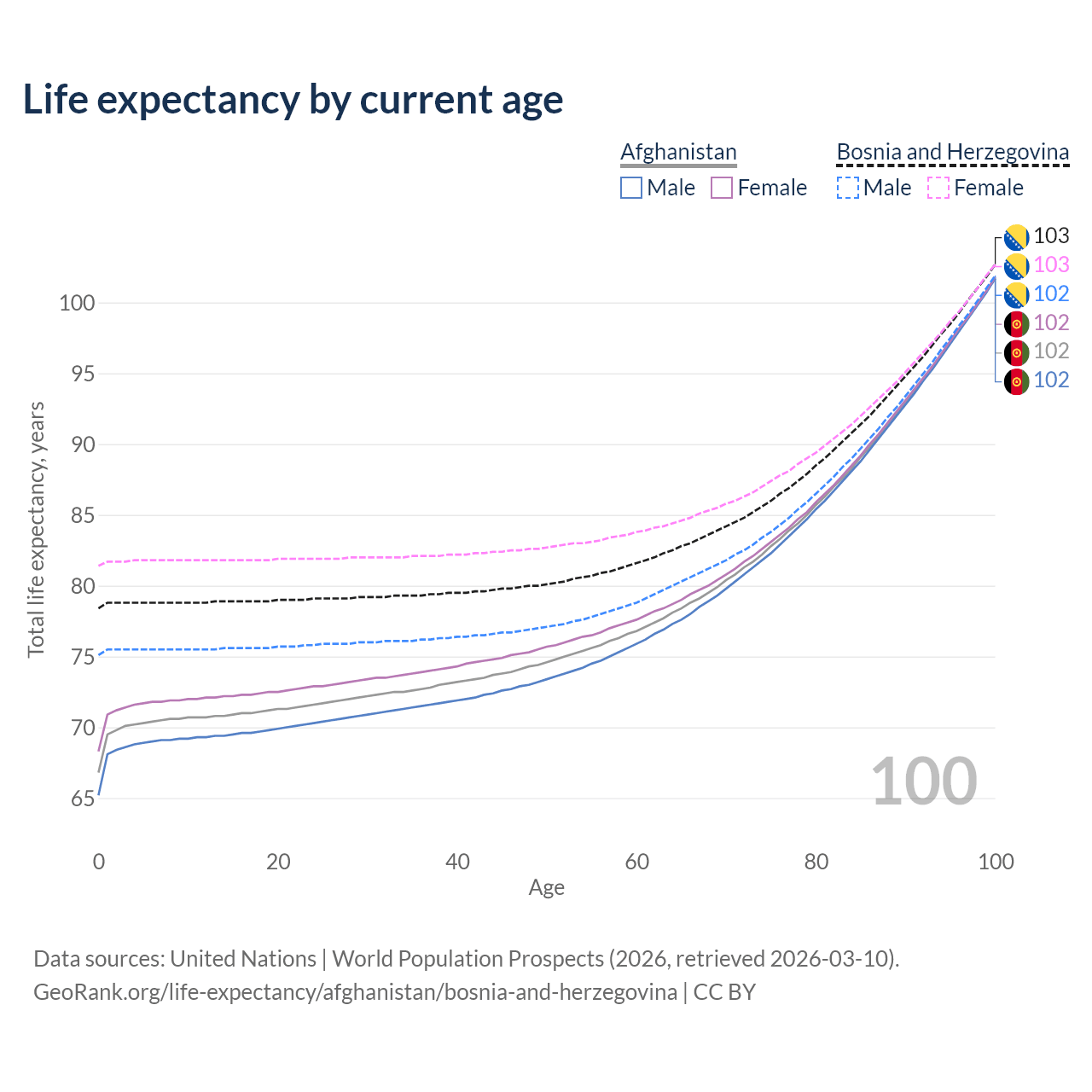 This life expectancy calculator shows the odds of living to 100, 95, 90, and below based on current age for both males and females in Afghanistan and Bosnia and Herzegovina, along with mean and median age of death. The calculations are based on the 2026 life tables (actuarial tables) from the UN World Population Prospects.