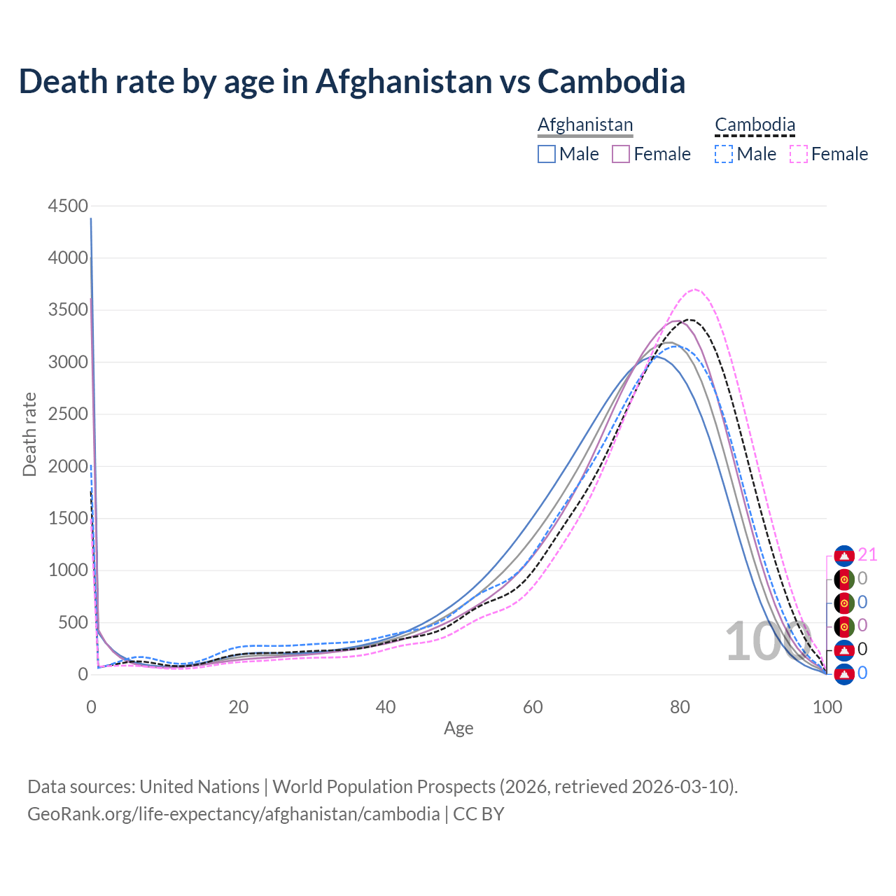 In Afghanistan, the most common age of death is 0, compared to 81 in Cambodia. The median age of death is 73 in Afghanistan and 76.5 in Cambodia, meaning only half of each cohort is expected to live past that age.