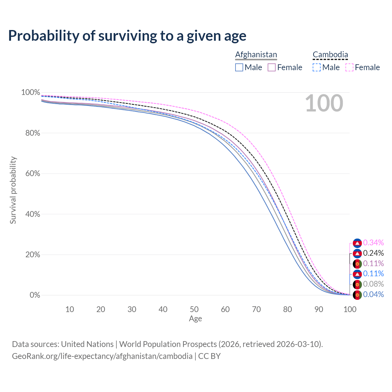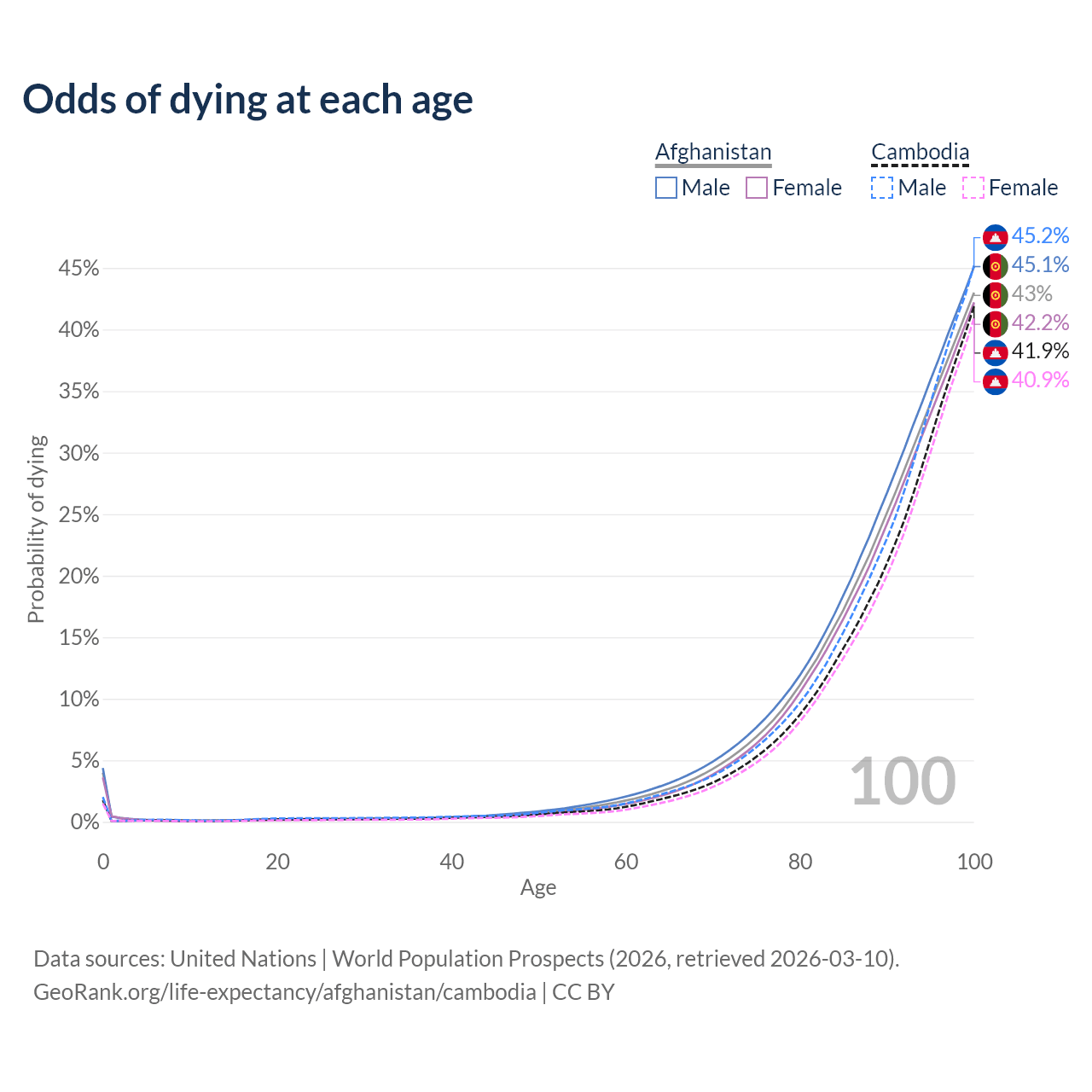 This life expectancy calculator shows the odds of living to 100, 95, 90, and below based on current age for both males and females in Afghanistan and Cambodia, along with mean and median age of death. The calculations are based on the 2026 life tables (actuarial tables) from the UN World Population Prospects.