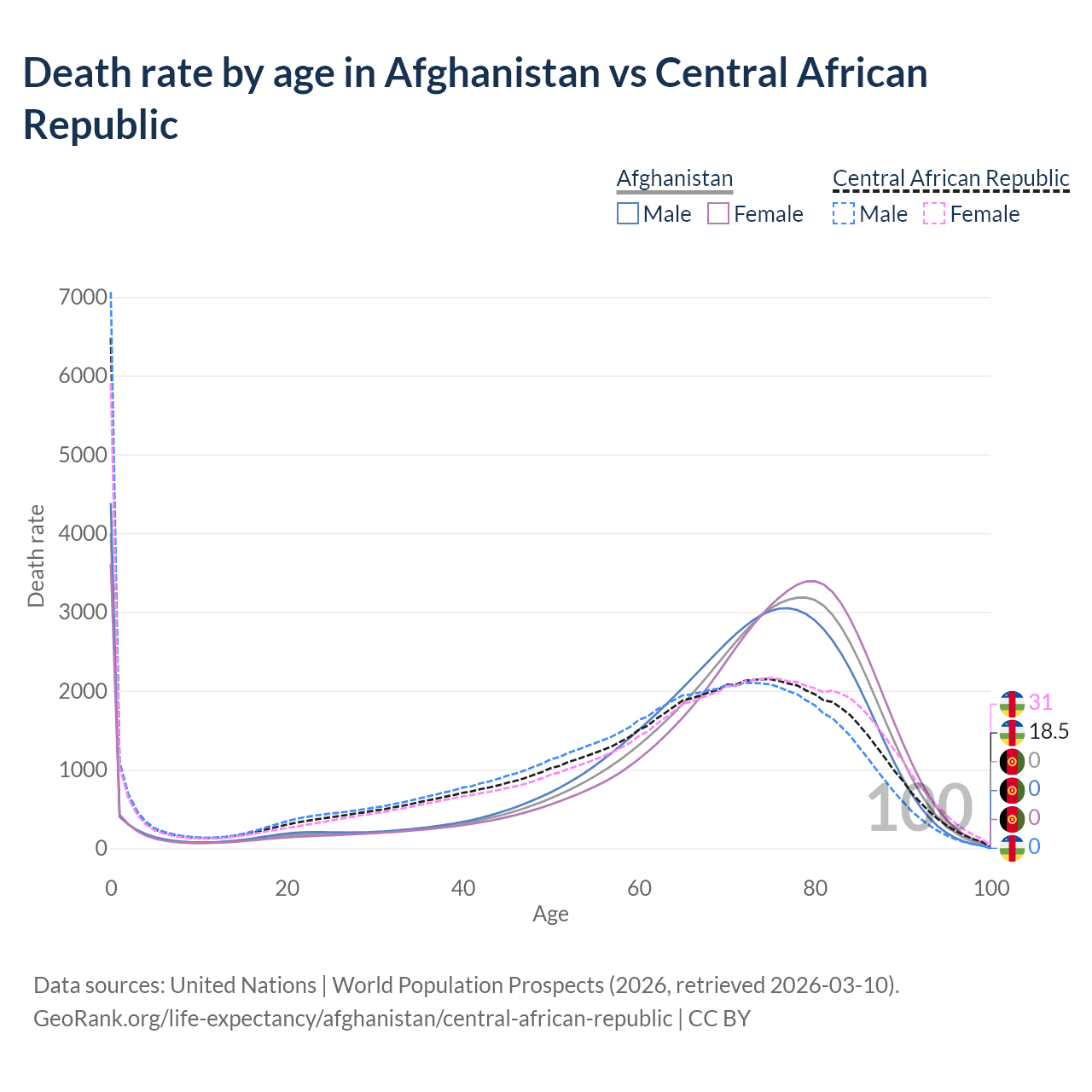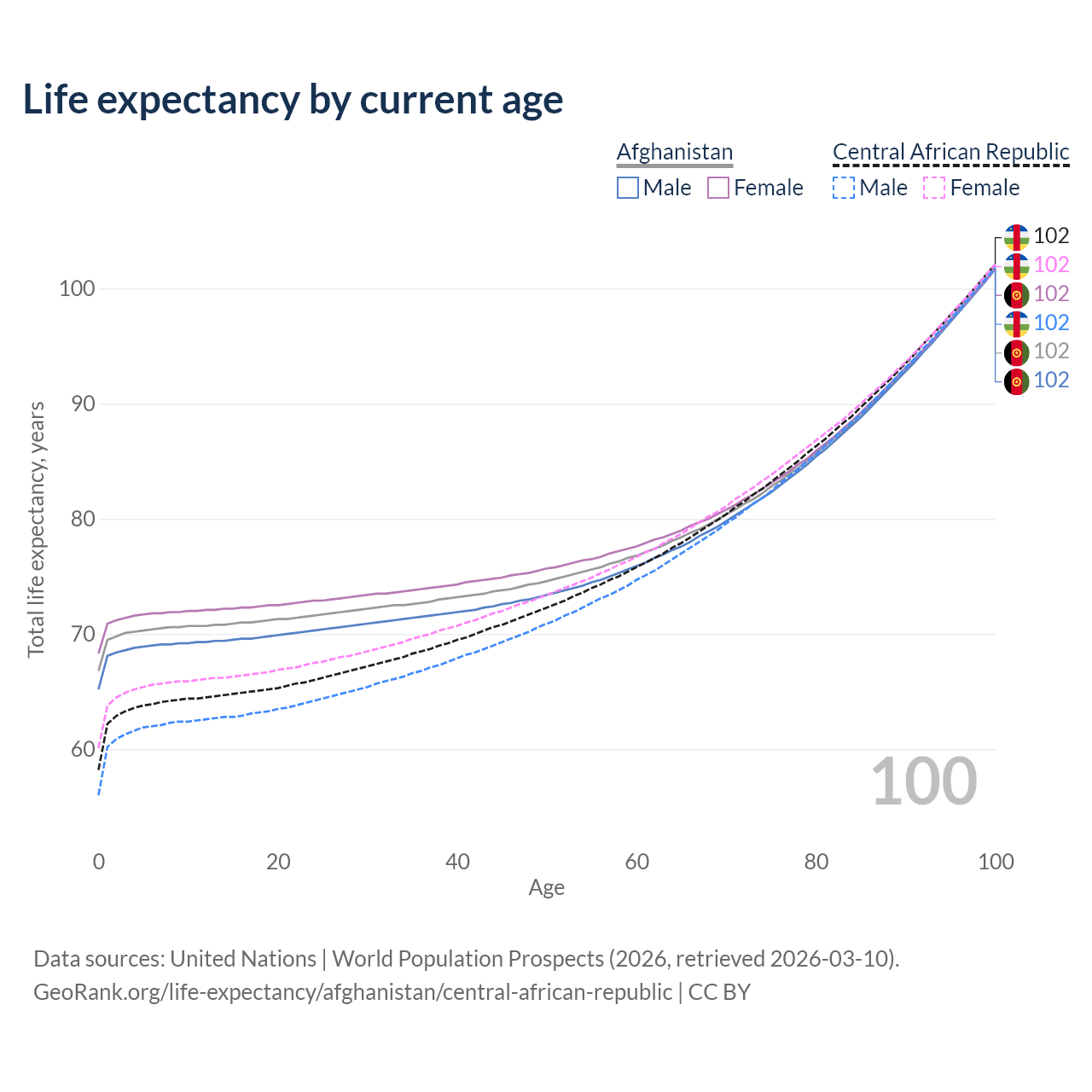 This life expectancy calculator shows the odds of living to 100, 95, 90, and below based on current age for both males and females in Afghanistan and the Central African Republic, along with mean and median age of death. The calculations are based on the 2026 life tables (actuarial tables) from the UN World Population Prospects.