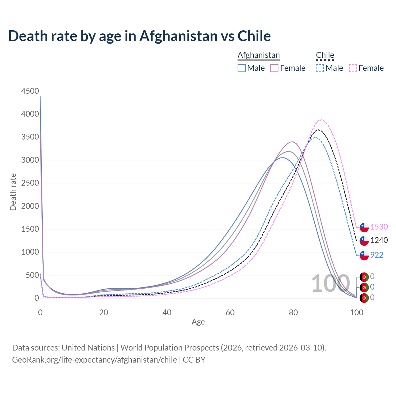 In Afghanistan, the most common age of death is 0, compared to 88 in Chile. The median age of death is 73 in Afghanistan and 84.8 in Chile, meaning only half of each cohort is expected to live past that age.
