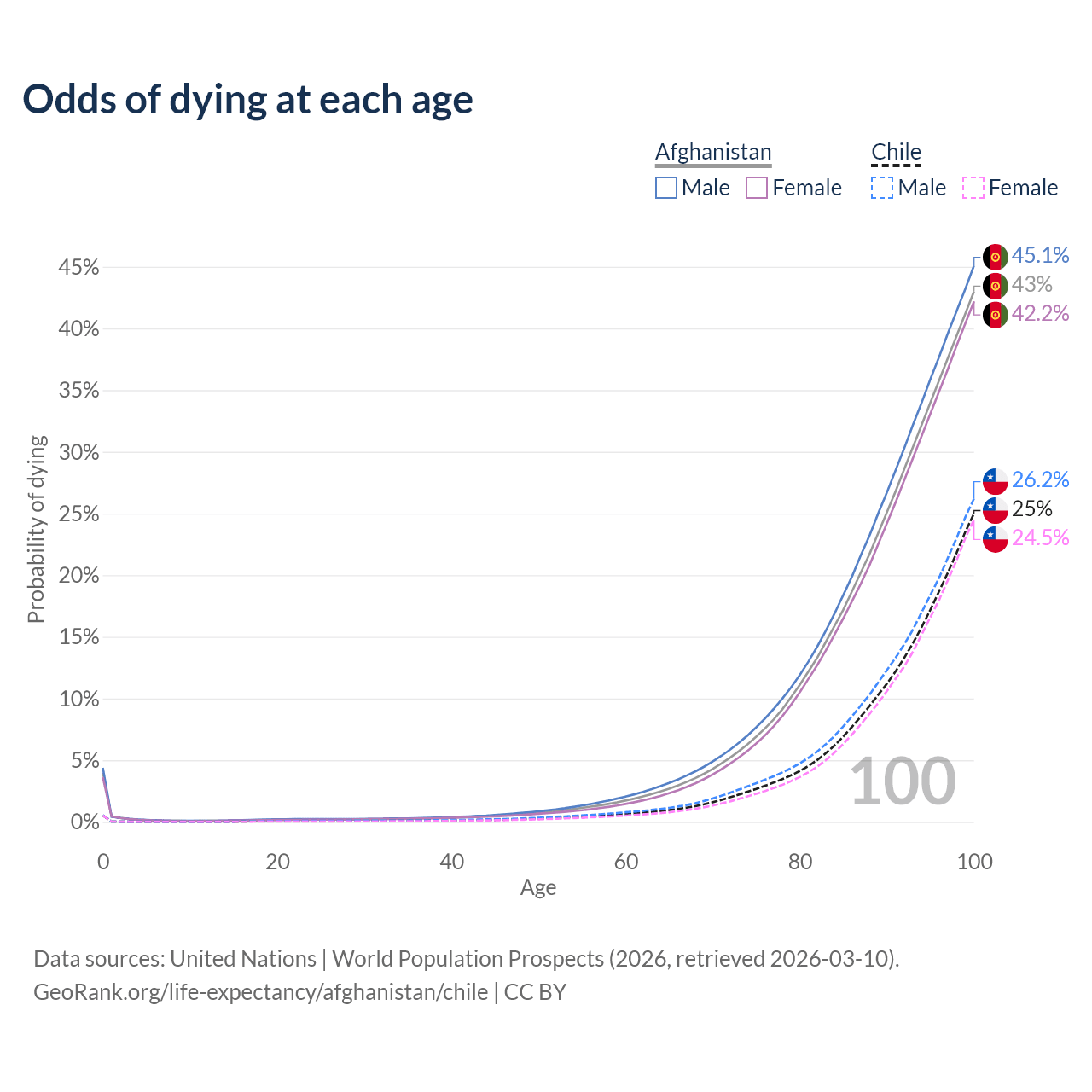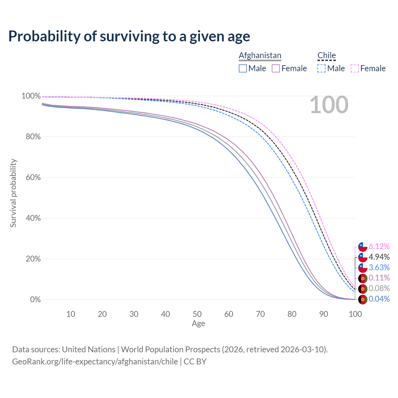 This life expectancy calculator shows the odds of living to 100, 95, 90, and below based on current age for both males and females in Afghanistan and Chile, along with mean and median age of death. The calculations are based on the 2026 life tables (actuarial tables) from the UN World Population Prospects.