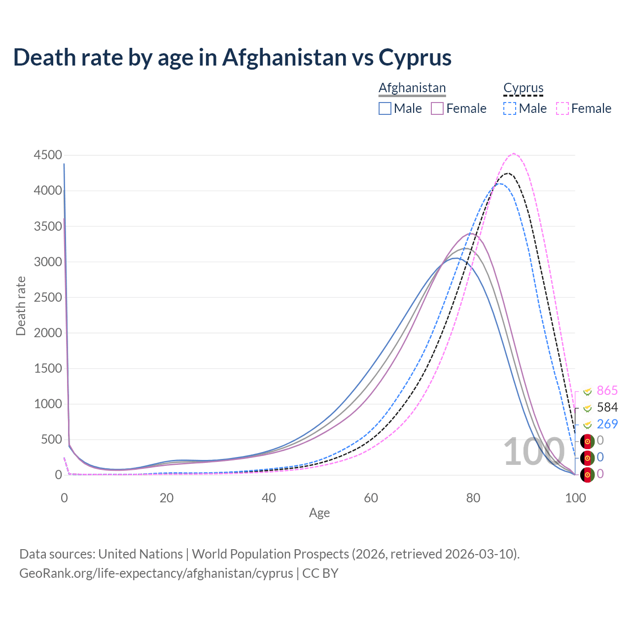 In Afghanistan, the most common age of death is 0, compared to 87 in Cyprus. The median age of death is 73 in Afghanistan and 84.3 in Cyprus, meaning only half of each cohort is expected to live past that age.