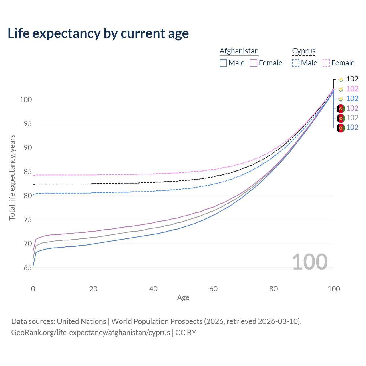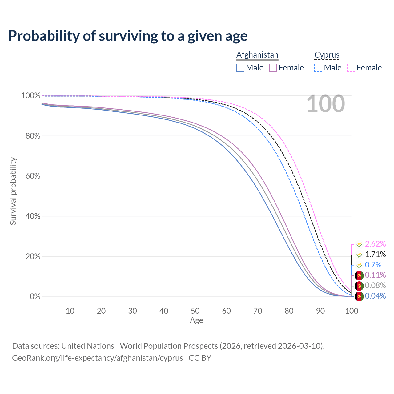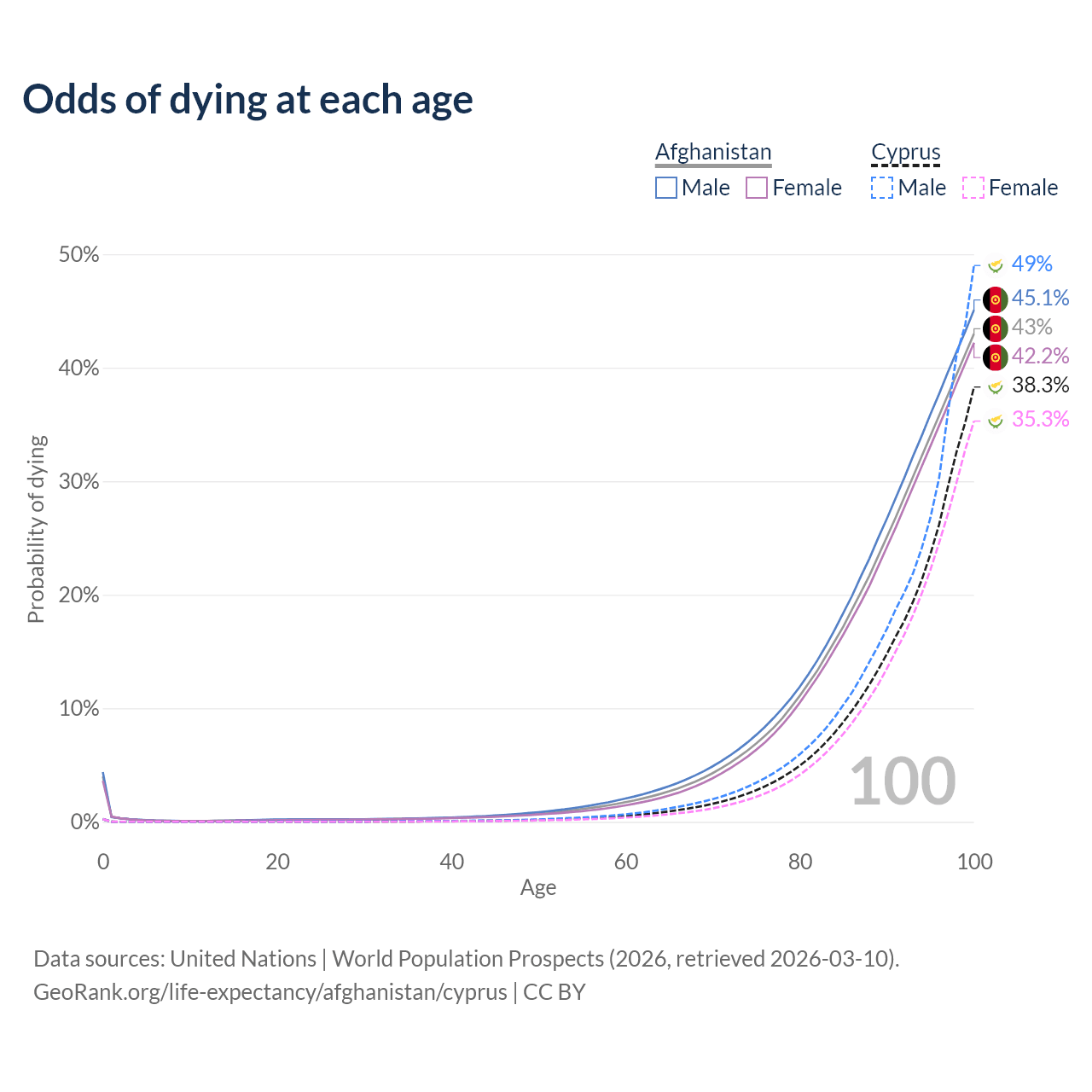 This life expectancy calculator shows the odds of living to 100, 95, 90, and below based on current age for both males and females in Afghanistan and Cyprus, along with mean and median age of death. The calculations are based on the 2026 life tables (actuarial tables) from the UN World Population Prospects.