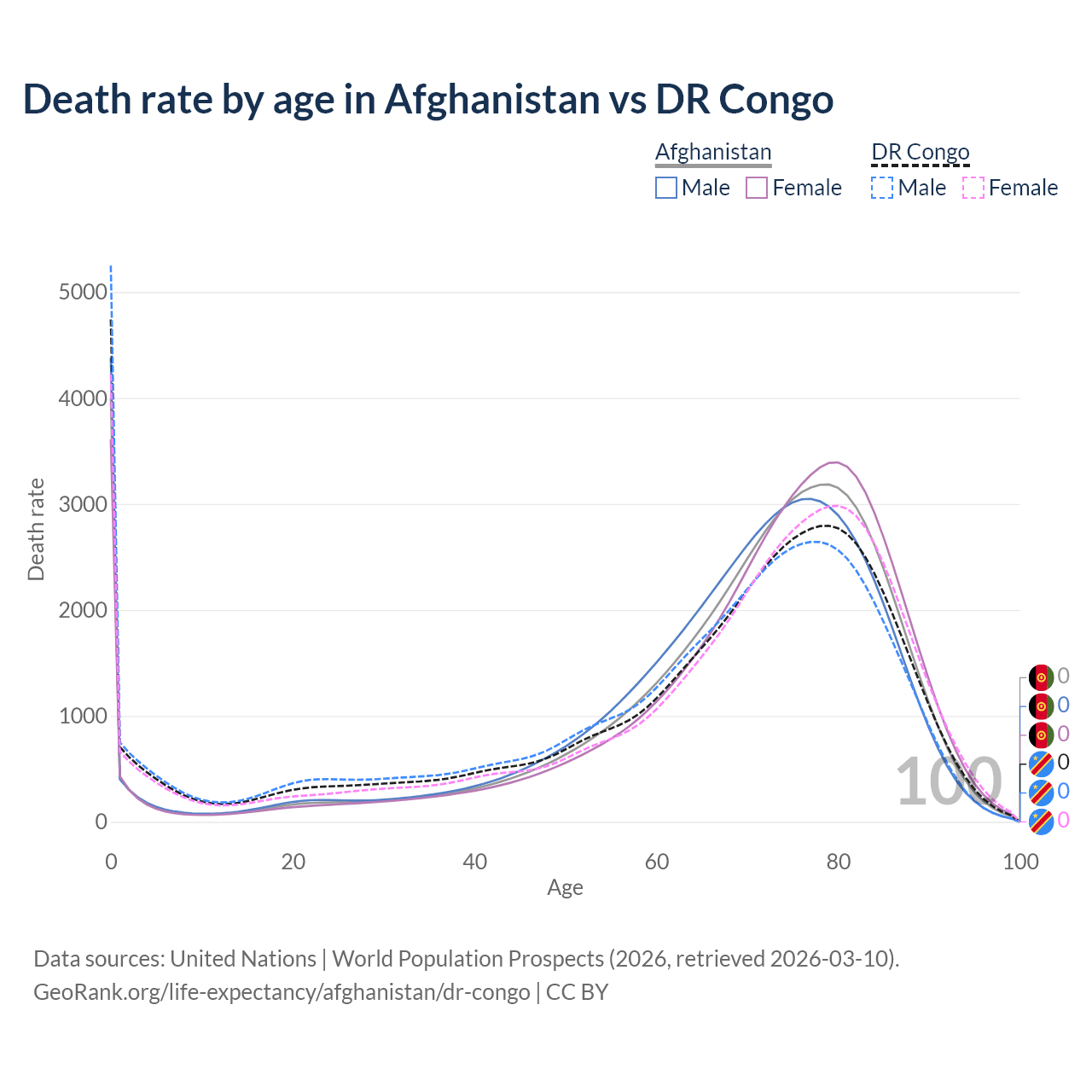 In Afghanistan, the most common age of death is 0, compared to 0 in the DR Congo. The median age of death is 73 in Afghanistan and 70.9 in the DR Congo, meaning only half of each cohort is expected to live past that age.