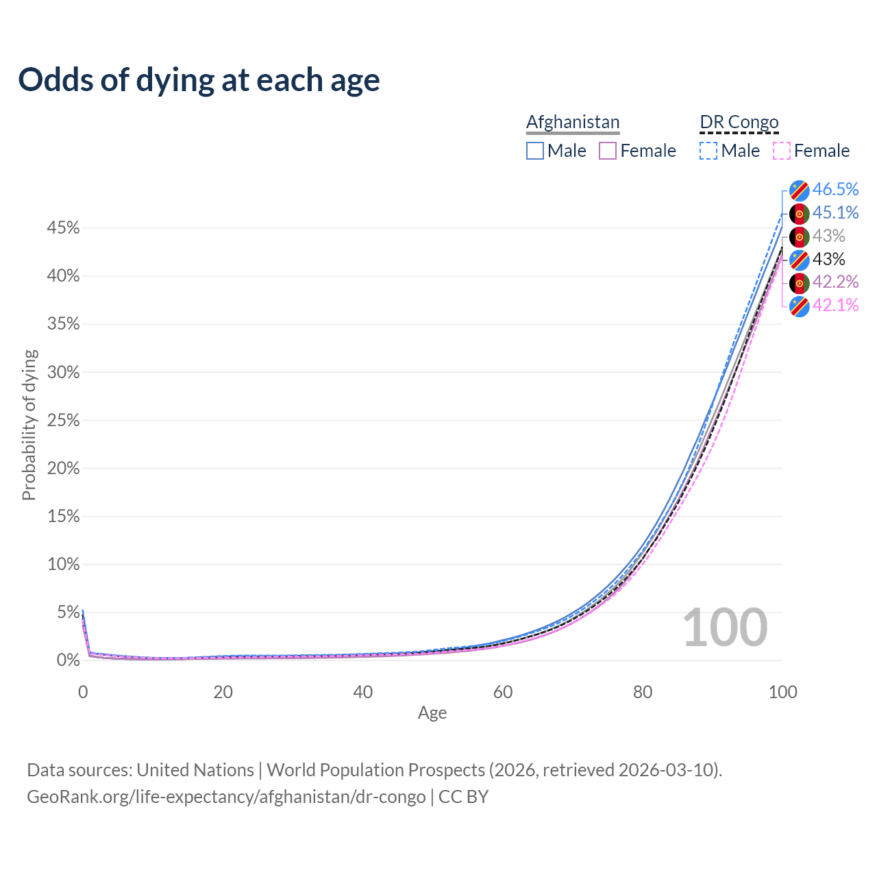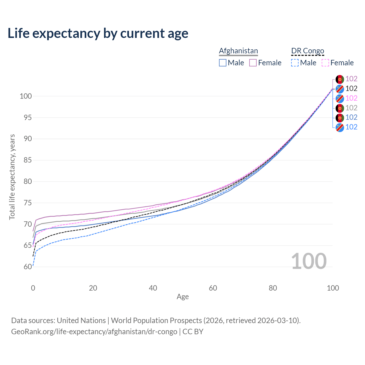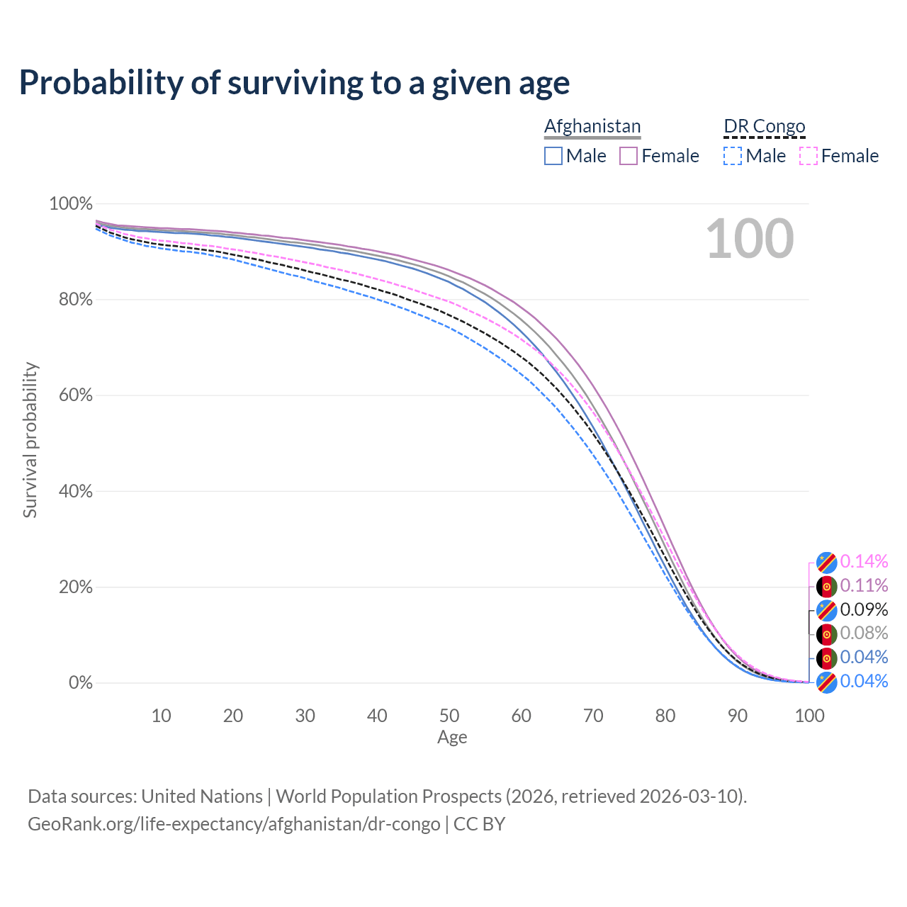 This life expectancy calculator shows the odds of living to 100, 95, 90, and below based on current age for both males and females in Afghanistan and the DR Congo, along with mean and median age of death. The calculations are based on the 2026 life tables (actuarial tables) from the UN World Population Prospects.