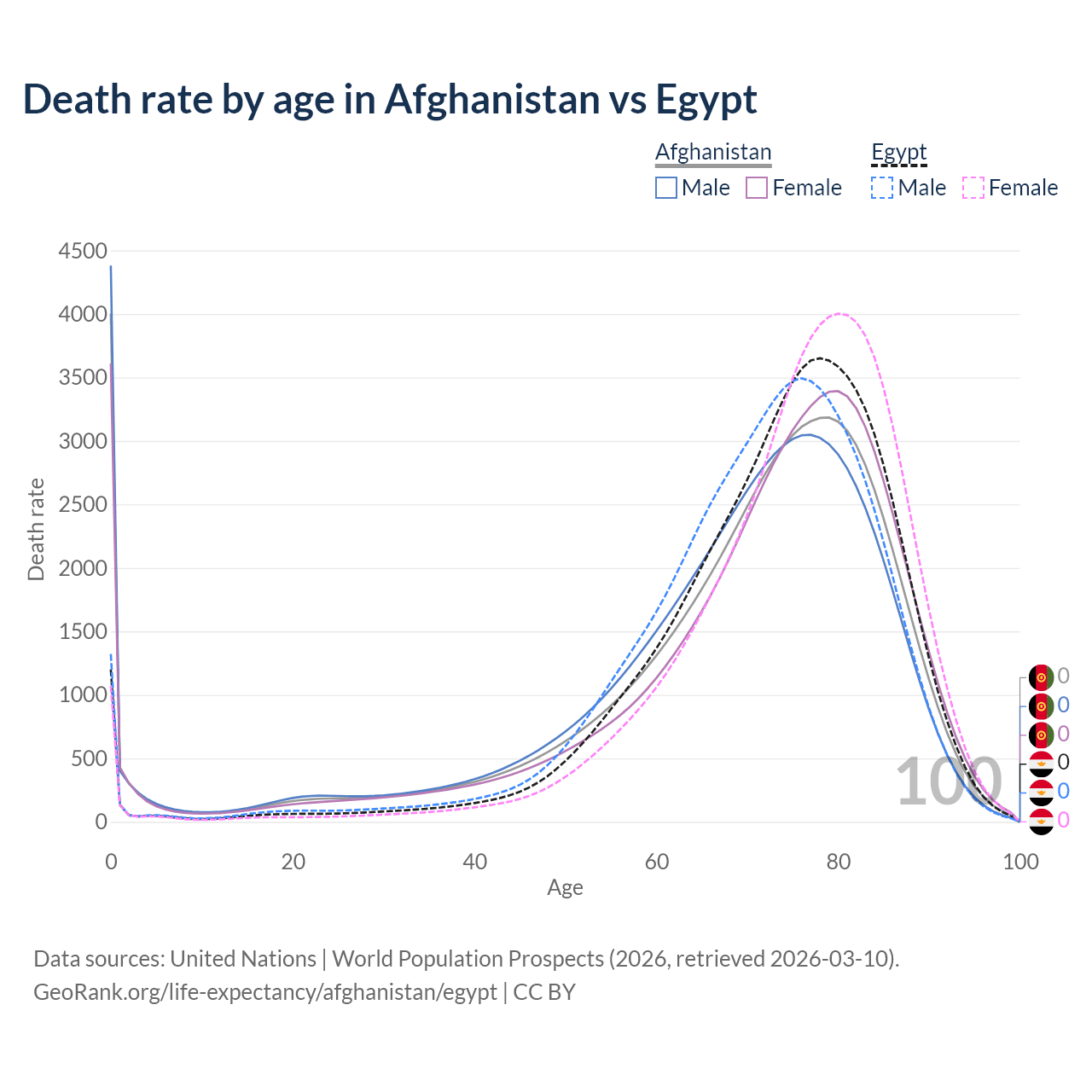 In Afghanistan, the most common age of death is 0, compared to 78 in Egypt. The median age of death is 73 in Afghanistan and 75.2 in Egypt, meaning only half of each cohort is expected to live past that age.