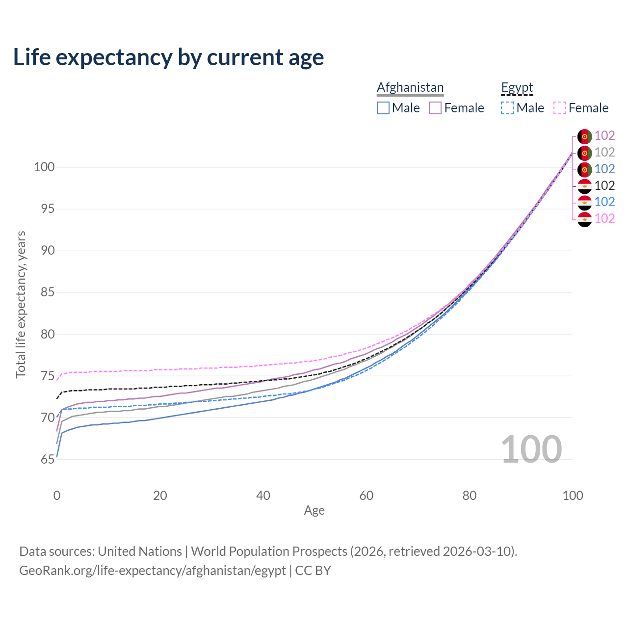 This life expectancy calculator shows the odds of living to 100, 95, 90, and below based on current age for both males and females in Afghanistan and Egypt, along with mean and median age of death. The calculations are based on the 2026 life tables (actuarial tables) from the UN World Population Prospects.