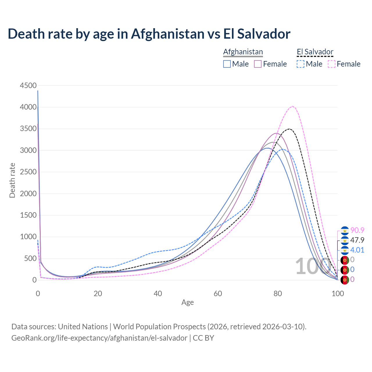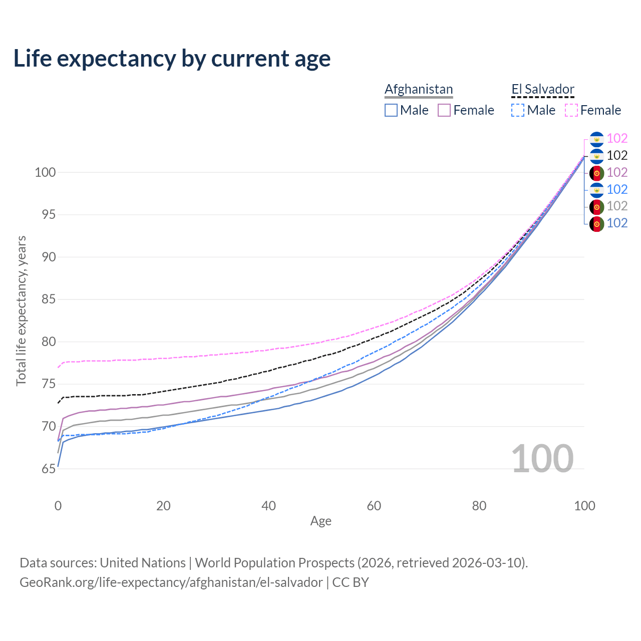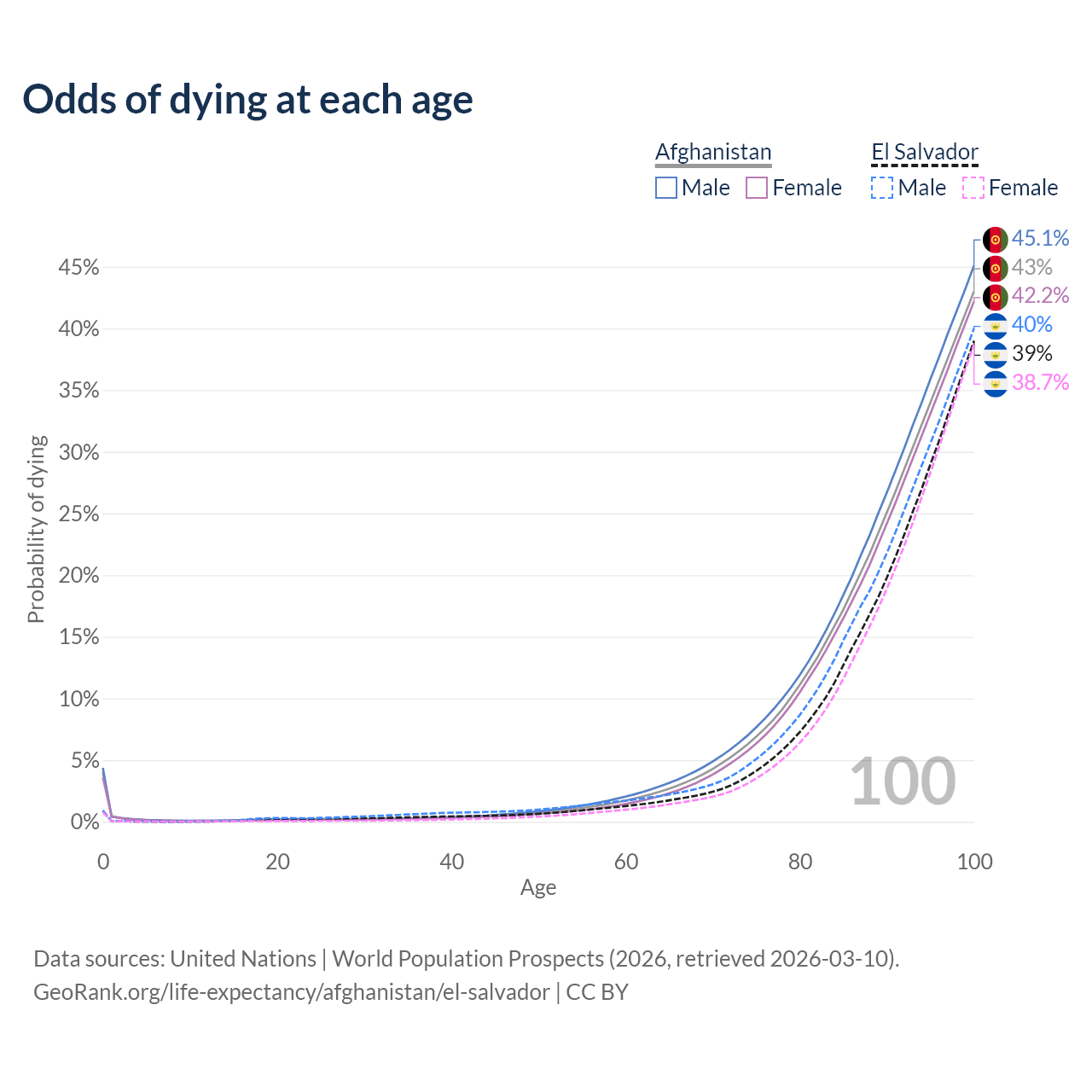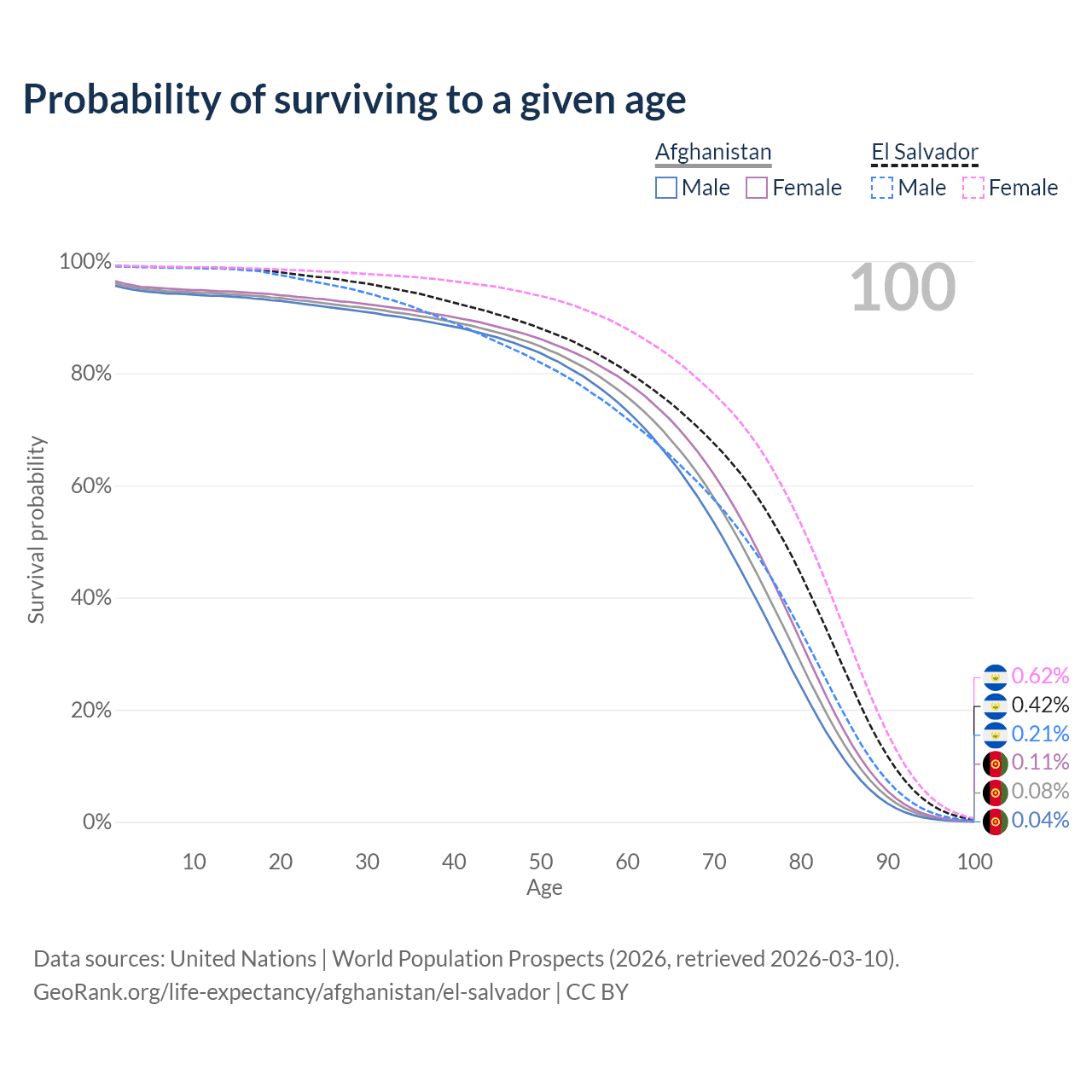 This life expectancy calculator shows the odds of living to 100, 95, 90, and below based on current age for both males and females in Afghanistan and El Salvador, along with mean and median age of death. The calculations are based on the 2026 life tables (actuarial tables) from the UN World Population Prospects.