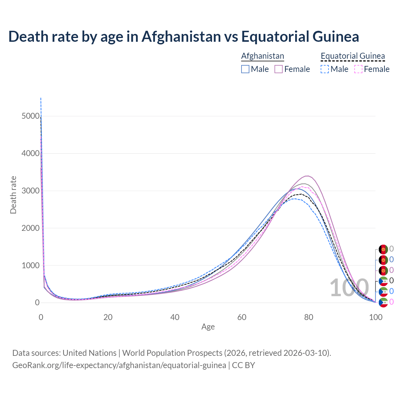 In Afghanistan, the most common age of death is 0, compared to 0 in Equatorial Guinea. The median age of death is 73 in Afghanistan and 71.3 in Equatorial Guinea, meaning only half of each cohort is expected to live past that age.