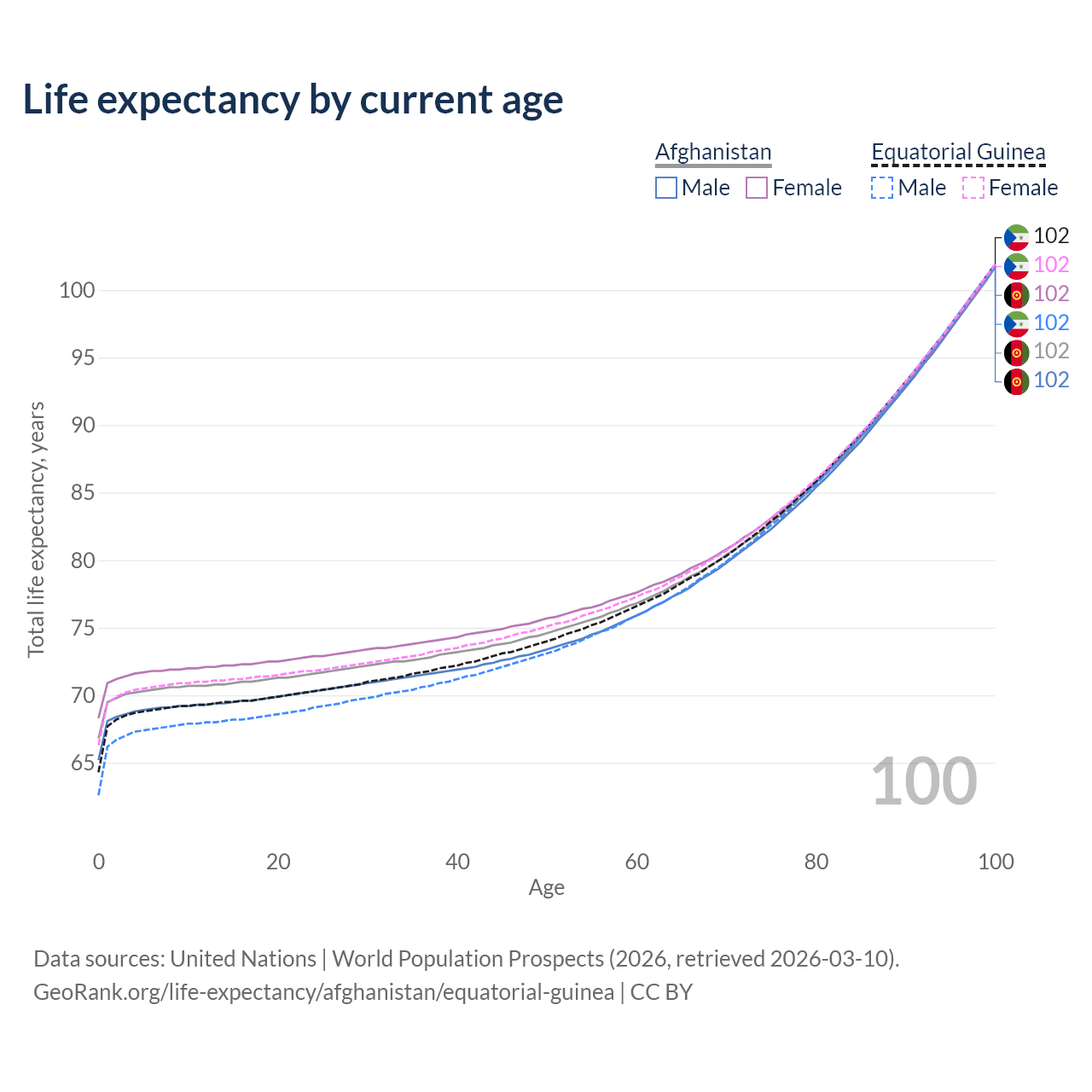 This life expectancy calculator shows the odds of living to 100, 95, 90, and below based on current age for both males and females in Afghanistan and Equatorial Guinea, along with mean and median age of death. The calculations are based on the 2026 life tables (actuarial tables) from the UN World Population Prospects.