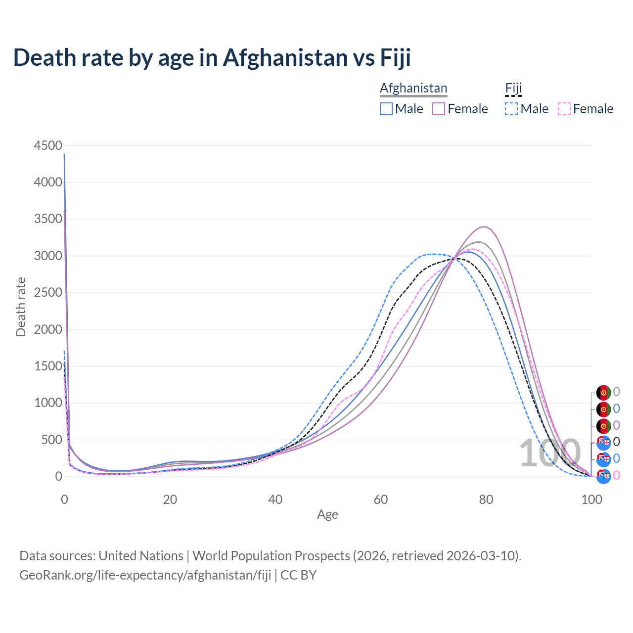 In Afghanistan, the most common age of death is 0, compared to 74 in Fiji. The median age of death is 73 in Afghanistan and 70.5 in Fiji, meaning only half of each cohort is expected to live past that age.