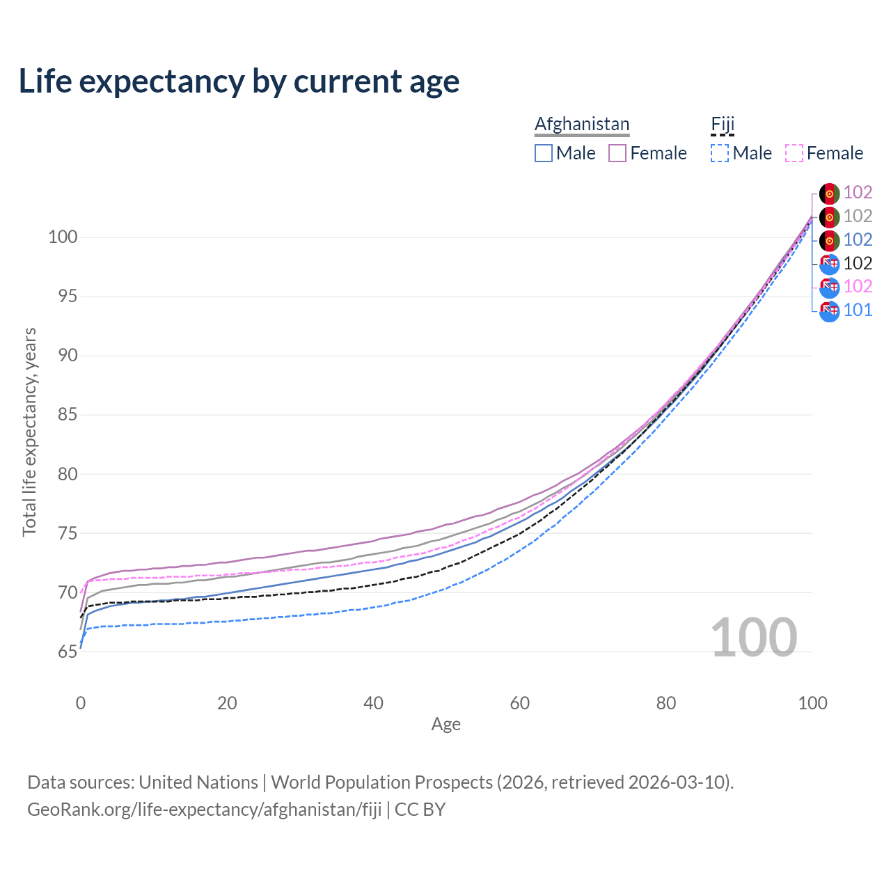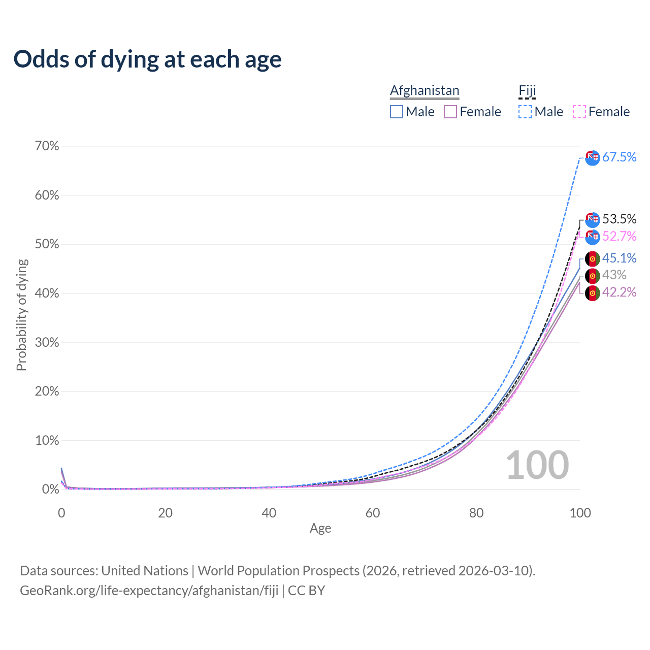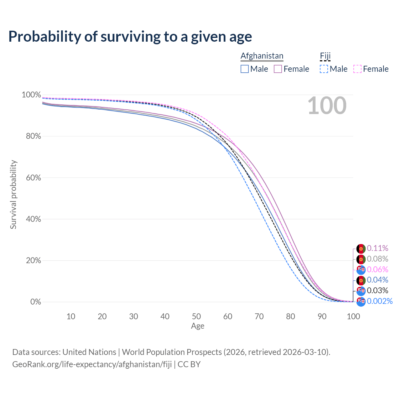 This life expectancy calculator shows the odds of living to 100, 95, 90, and below based on current age for both males and females in Afghanistan and Fiji, along with mean and median age of death. The calculations are based on the 2026 life tables (actuarial tables) from the UN World Population Prospects.