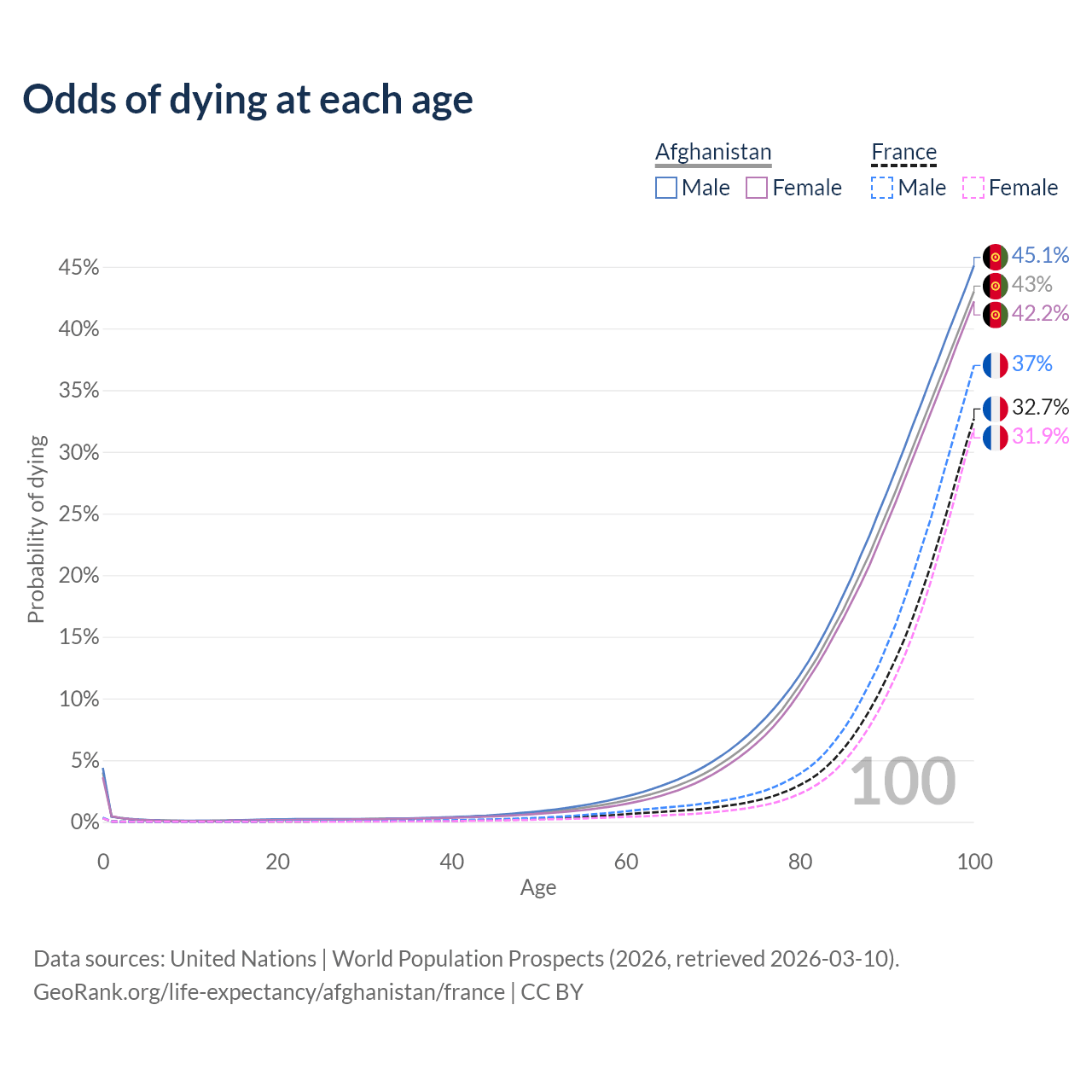 This life expectancy calculator shows the odds of living to 100, 95, 90, and below based on current age for both males and females in Afghanistan and France, along with mean and median age of death. The calculations are based on the 2026 life tables (actuarial tables) from the UN World Population Prospects.