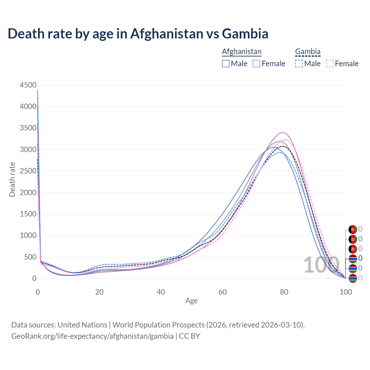 In Afghanistan, the most common age of death is 0, compared to 80 in the Gambia. The median age of death is 73 in Afghanistan and 73.4 in the Gambia, meaning only half of each cohort is expected to live past that age.