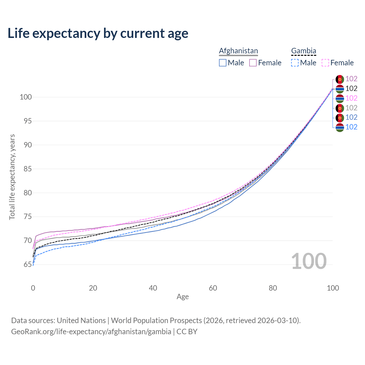 This life expectancy calculator shows the odds of living to 100, 95, 90, and below based on current age for both males and females in Afghanistan and the Gambia, along with mean and median age of death. The calculations are based on the 2026 life tables (actuarial tables) from the UN World Population Prospects.