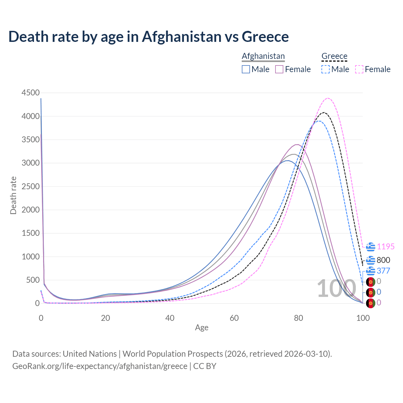In Afghanistan, the most common age of death is 0, compared to 88 in Greece. The median age of death is 73 in Afghanistan and 84.9 in Greece, meaning only half of each cohort is expected to live past that age.